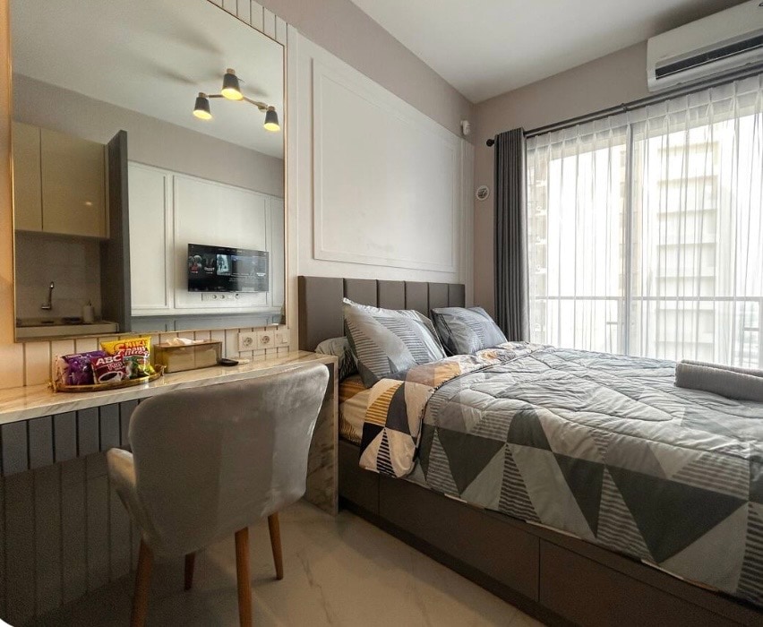Disfruta de una experiencia con estilo en un lugar céntrico cerca de instalaciones de entretenimiento, compras y lugares de recreación Instalaciones de la habitación - 1 cama tamaño king - Wifi + Netflix - Calentador de agua - Frigorífico - Dispensador - Aire acondicionado - TV - Tocador - Secador de pelo - Plancha - Cocina y utensilios Instalaciones del edificio - Piscina - Gimnasio - Cafetería - Minimercado * Indomaret * Cirkel K 24 horas - Aparcamiento (de pago) - Lavandería Entretenimiento y compras - Aeon Mall - Ice BSD - The breeze bsd - Q big Mall