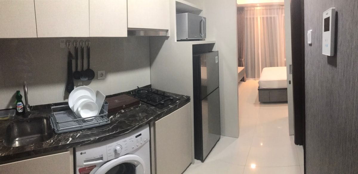 Apartamento estudio para dos personas ubicado frente al centro comercial Aeon de Japón, frente a ICE BSD, la exposición EXPO más grande de Indonesia y junto a la universidad Prasetia Mulya. El barrio es tranquilo, en el vestíbulo hay muchos restaurantes y puestos de comida, en el segundo piso hay una zona de comidas y una sala de billar, hay un indomaret y un cajero automático BCA, y a aproximadamente 1 km al este está el centro comercial BREEZE y edificios de oficinas como unilever y traveloka. También hay otros lugares de entretenimiento y culinarios en BSD y los alrededores.