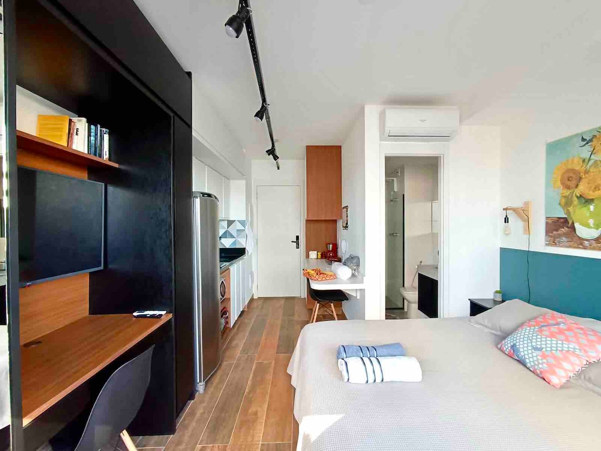 A solo 600 metros del METRO FARIA LIMA. - Estudio nuevo y acogedor para tu estancia. - SmartTV - Cocina equipada. - Internet de 300 MB. - 2 camas (una es un sofá cama) - aire acondicionado Áreas comunes del edificio: - Solárium con chimenea. - Jardín - Espacio de fitness completo. - Coworking con internet gratis. - Cine (pagado por separado). - lavandería (paga parte) - Churrasqueira (paga parte) distrito: fácil acceso a hospitales, universidades y eventos urbanos. - Gran oferta de Uber, taxi y transporte público.