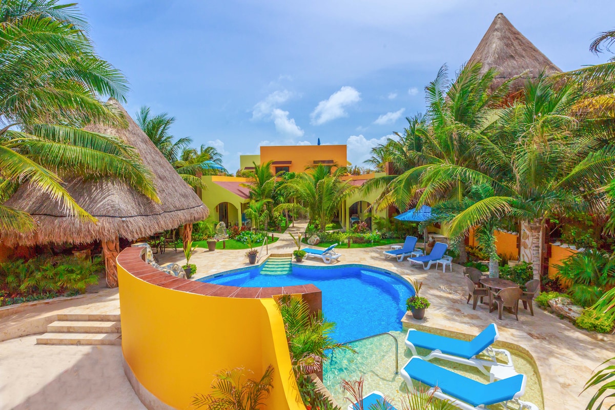 Beautiful luxury house with Mayan and hardwood style. A authentic Prehispanic experience. The suite has a equipped kitchen , bathroom, bedroom with smart TV ,and closet, private terrace and garden and a large shared pool chlorine free. Hermosa suite de lujo con acabados en maderas preciosas y estilo Maya. Una autentica experiencia mexicanca estilo prehispanico. Cuenta con cocina equipada,baño completo,recamara con Smart TV y closet,terraza y jardin privados y gran alberca sin cloro , compartida