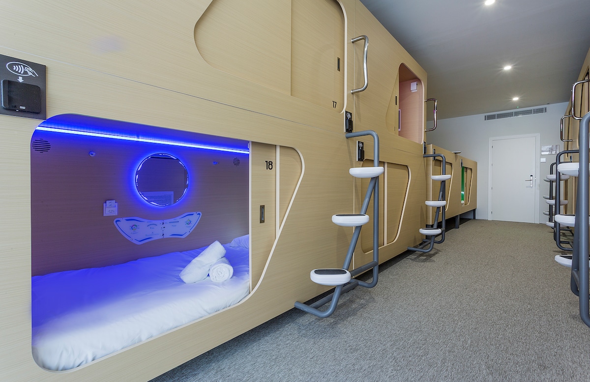 Disfruta de una estancia única con instalaciones modernas diseñadas para mantener la sostenibilidad y el confort. Los Hoteles cápsula son una alternativa práctica para viajeros que buscan una estancia funcional en el centro de la ciudad. Nuestras cápsulas se encuentran a dos alturas: casi a ras de suelo las inferiores y aproximadamente a un metro y medio las superiores, a las que se accede mediante una escalera.
