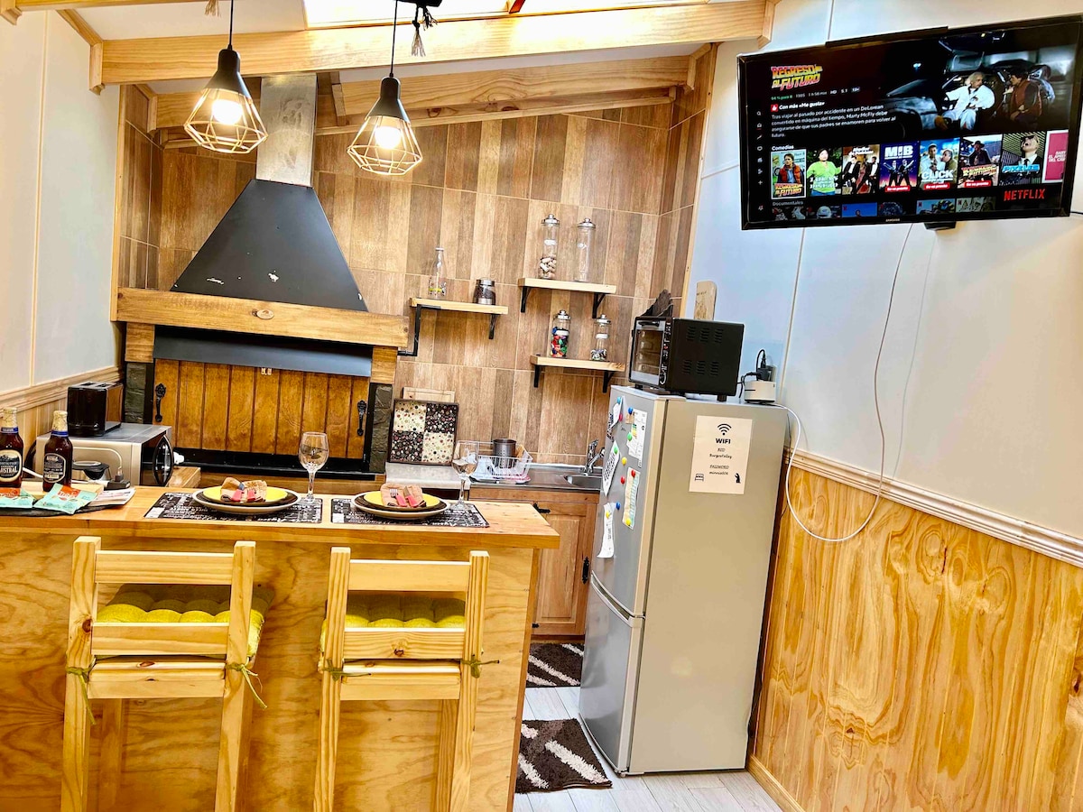 Ideal para 4 personas,un dormitorio con dos camas y otro dormitorio con cama de 2 plazas .Consta de 1 baño y pequeña cocina . Cuenta con cocinilla tipo camping, microonda, hervidor, mini refrigerador, con toda la implementación para cocinar y servir . Tiene transporte público en la misma calle y supermercado a una cuadra. Además consta de 1 televisor con Cable y wifi en toda la cabaña. Además tiene estacionamiento privado para dejar seguro el vehículo en el patio.