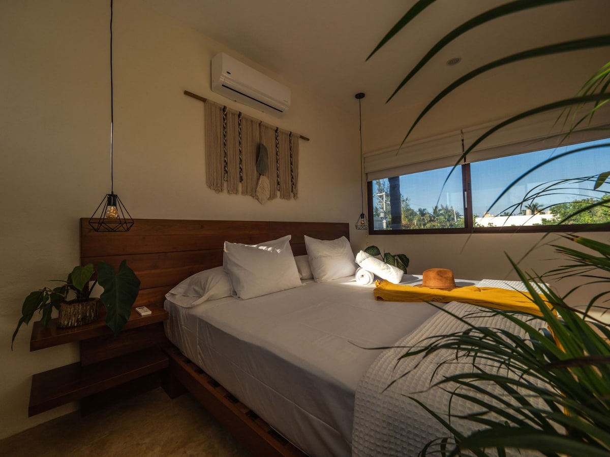 Disfruta del confort en nuestro departamento 04 privado con cama matrimonial cómoda y ubicado en la mágica isla Holbox rodeado de un ambiente tranquilo, céntrico y acogedor. Cuenta con los servicios de wifi, cocina equipada, aire acondicionado, ventilador, clóset, TV, baño privado con agua caliente, toallas, jabón, shampoo, mesa y sillas. A 2 min del ferry y a 5 min de cajero, tiendas, farmacias y restaurantes. La playa y el parque central están a 8 minutos a pie. Opción ideal para parejas.