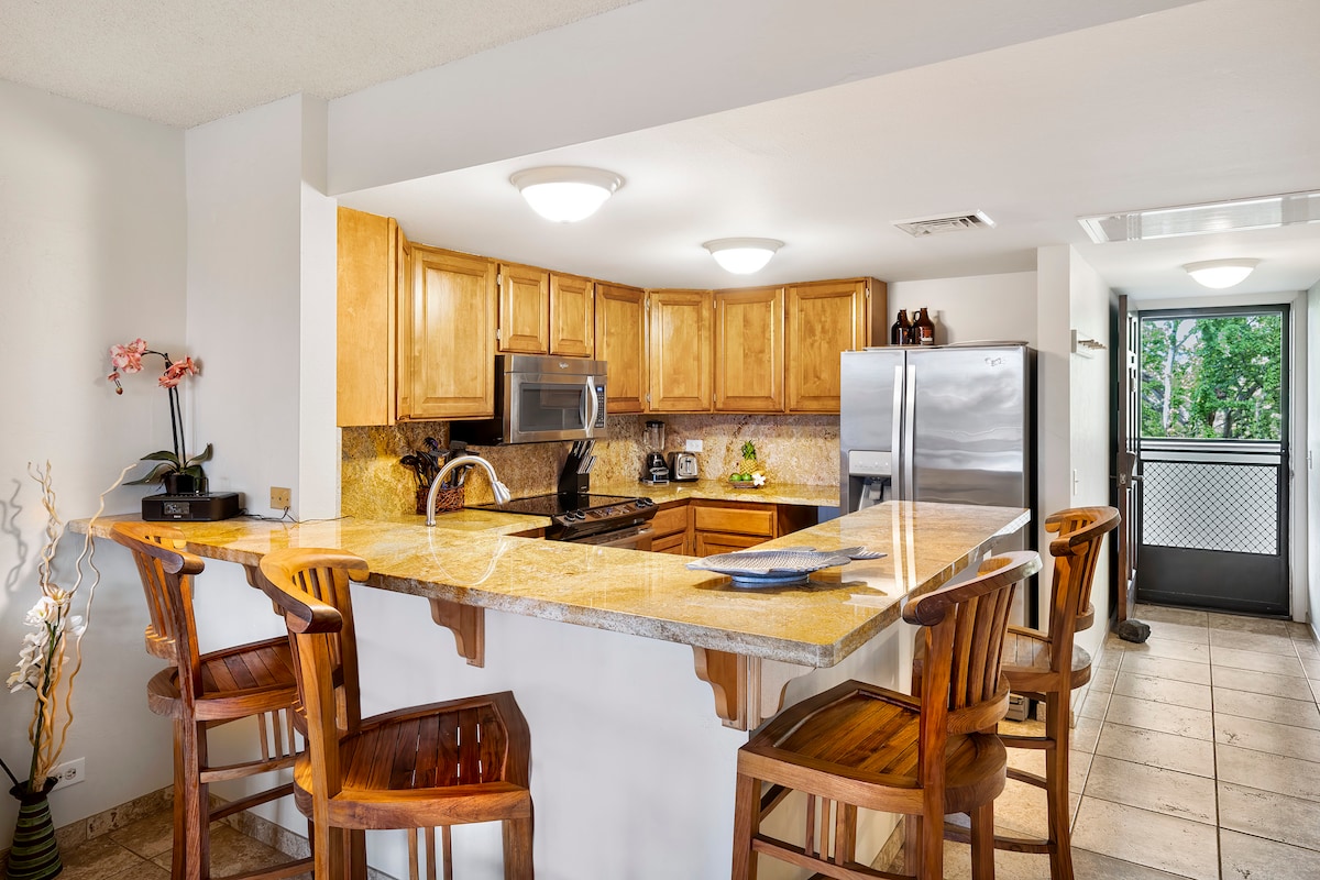 Stylish top-floor condo at White Sands Village, directly across from Magic Sands Beach. Fully updated with new A/C, ceiling fans in every room, tiled floors, modern appliances, and granite baths. Relax on your private lanai with partial ocean view and enjoy resort amenities including a heated pool, hot tub, BBQs, tennis/pickleball courts, sauna, and clubhouse. Beach gear provided—chairs, snorkels, boogie boards, and cooler. Close to Kahaluʻu Beach, great snorkeling, and downtown Kona.