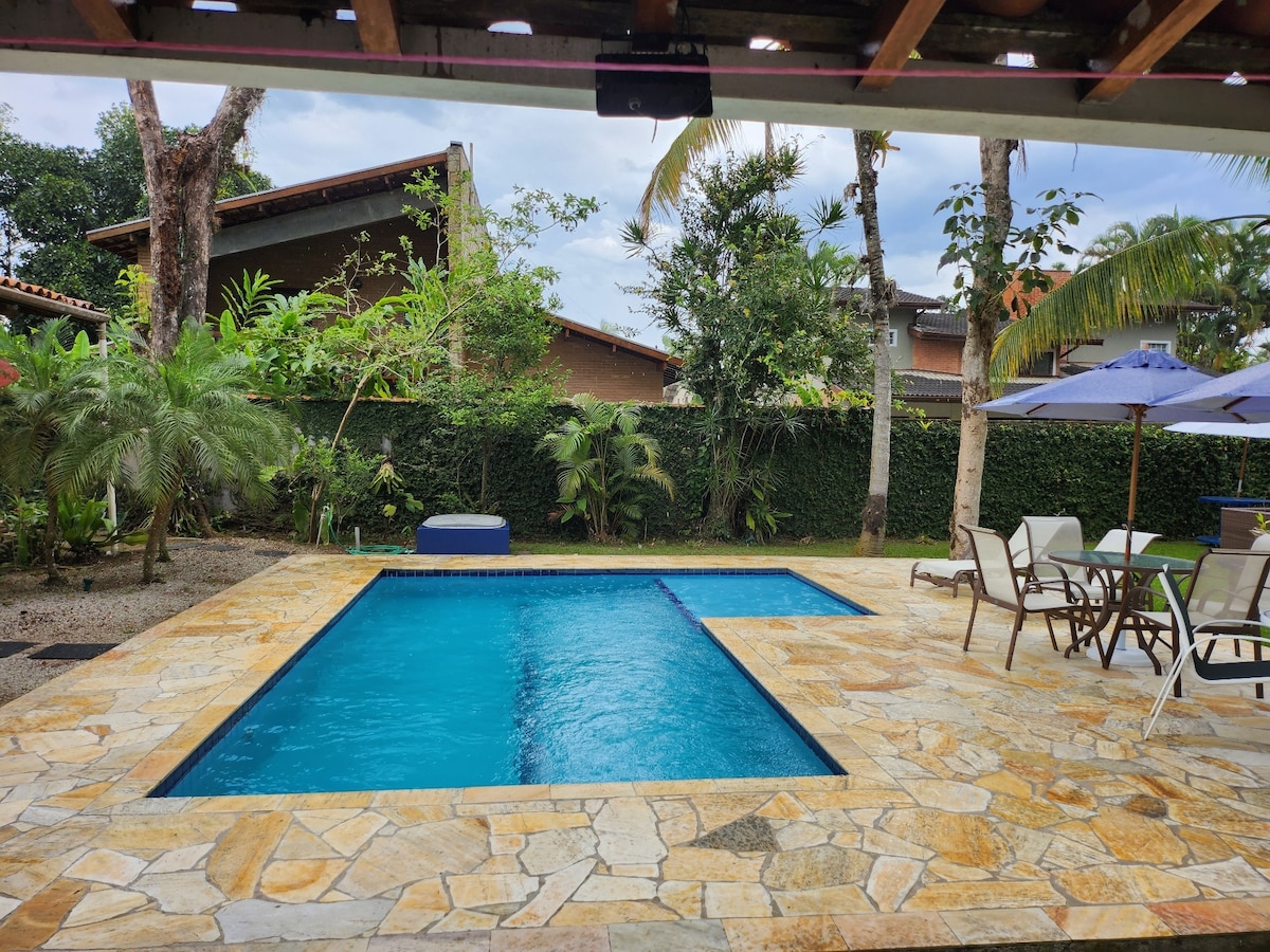 🏝️ Está a solo 4 minutos a pie de la playa, dentro del condominio Itamambuca, ¡uno de los más seguros de Ubatuba! 🍽️ Infraestructura completa con encantadores restaurantes, heladerías, tiendas de conveniencia, mercado y panadería. Increíble 🌿 área exterior de 500 metros cuadrados con: • Hermosa piscina de azulejos. • Barbacoa y horno para pizzas. • Zona verde con bosque nativo, palmeras, césped para disfrutar de la naturaleza. 🛏️ Hay 4 baños en suite y 2 dormitorios más pequeños, todos con aire acondicionado. 👪 ¡Capacidad para 23 personas!