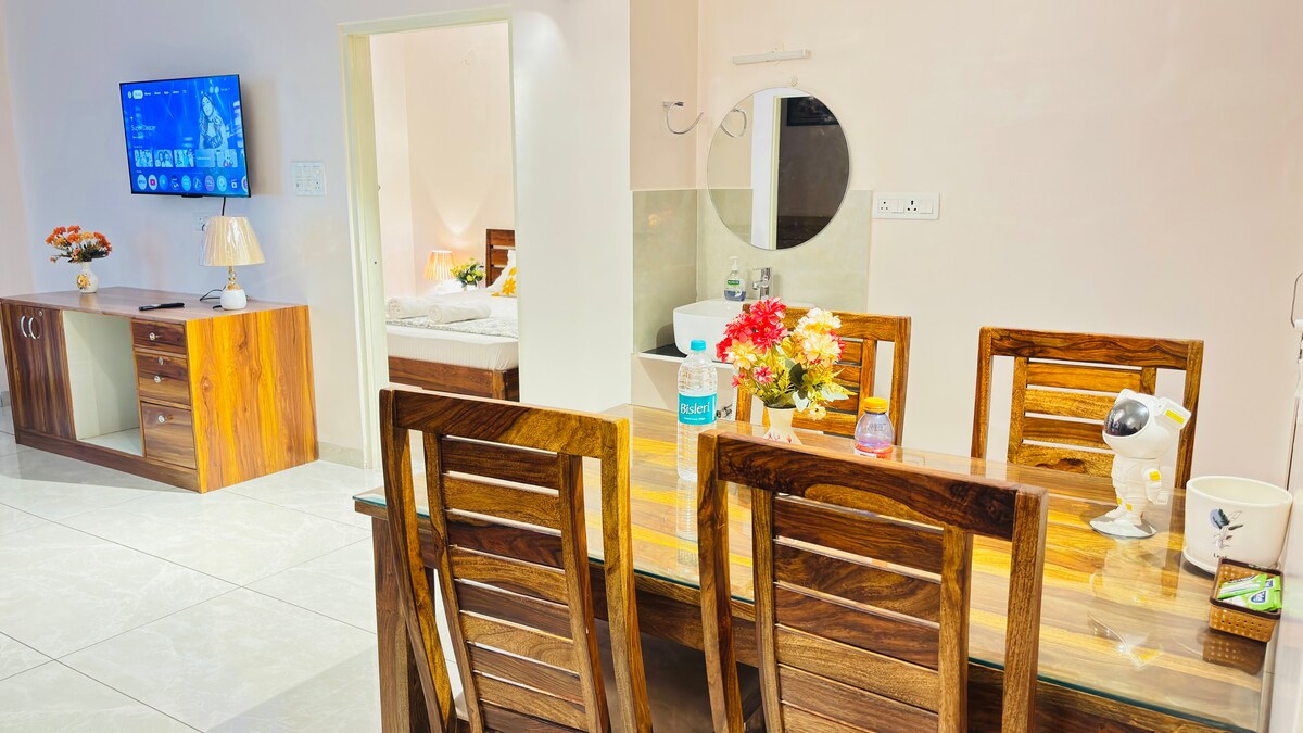 The spacious 3BHK Airbnb offers a perfect blend of modern comfort and style. The expansive living hall is ideal for relaxation while the sleek dining area ensures enjoyable meals. The kitchen makes cooking a breeze. The cozy garden provides a peaceful outdoor retreat. Unwind on the verandah or enjoy NETFLIX on the 65-inch LED TV. With ample space & thoughtful amenities, this contemporary home is perfect for families or groups seeking a stylish, convenient stay with a touch of luxury & comfort.