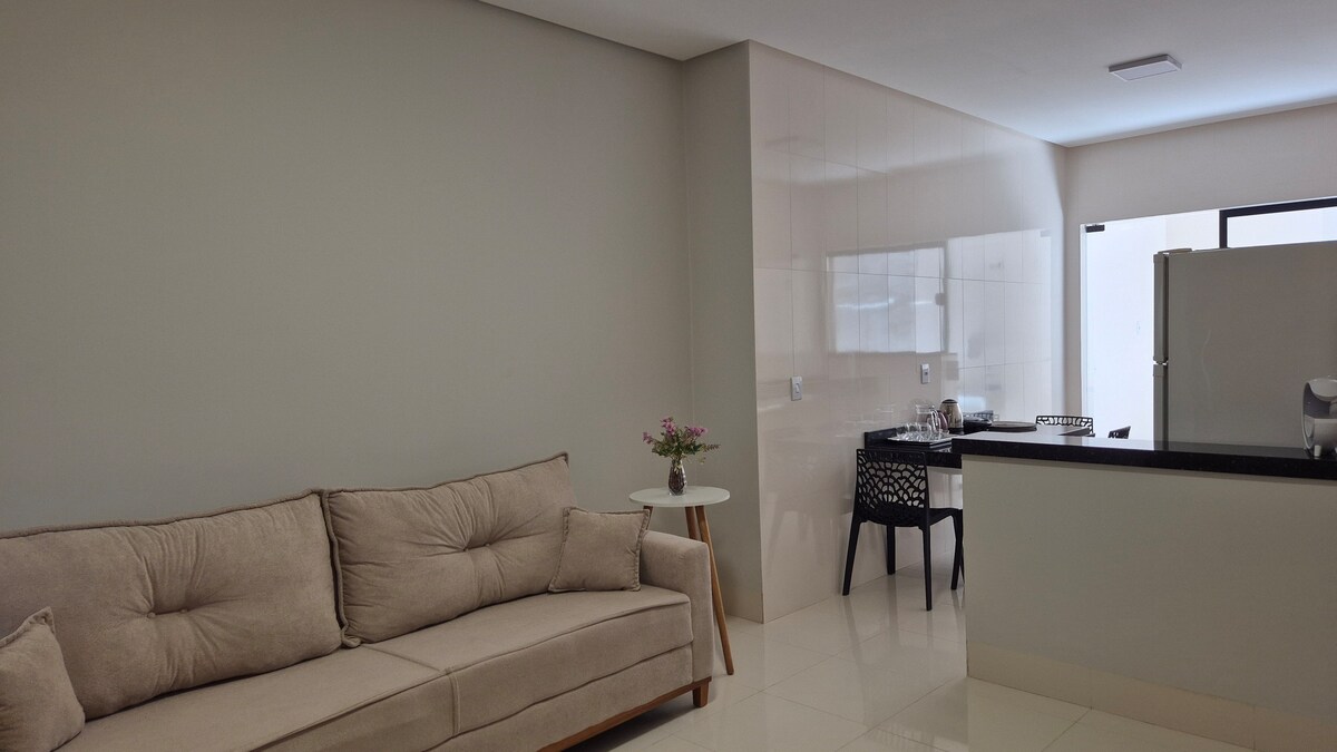 Abrace a simplicidade neste lugar tranquilo e bem-localizado. Apartamento com suíte para duas pessoas, quarto climatizado, cozinha espaçosa, quintal. tem escada para ir para o quarto. local bem localizado, em frente praça, ao lado de supermercado próximo a restaurante, farmácia e hospital. tenho disponibilidade de camas para quem está em um grupo maior.