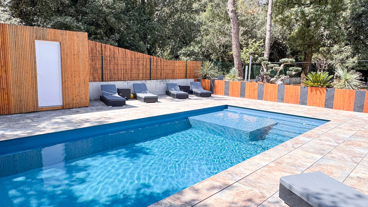 Esta casa de planta baja consta de una sala de estar de 50 M2 con chimenea, una cocina equipada, 5 dormitorios, lavadero, 2 baños, 2 aseos y una terraza. La sala de estar se abre a 3 terrazas, 1 de ellas cubierta de 38 M2, frente a la piscina con capacidad para 10 personas. La piscina de 4,50 m X 9 m, está equipada con un SPA, y está asegurada por una cúpula extraíble y asegurada por un candado en la puerta El terreno de 970 M2 está cerrado y arbolado y sin vecinos. La casa está equipada Wifi