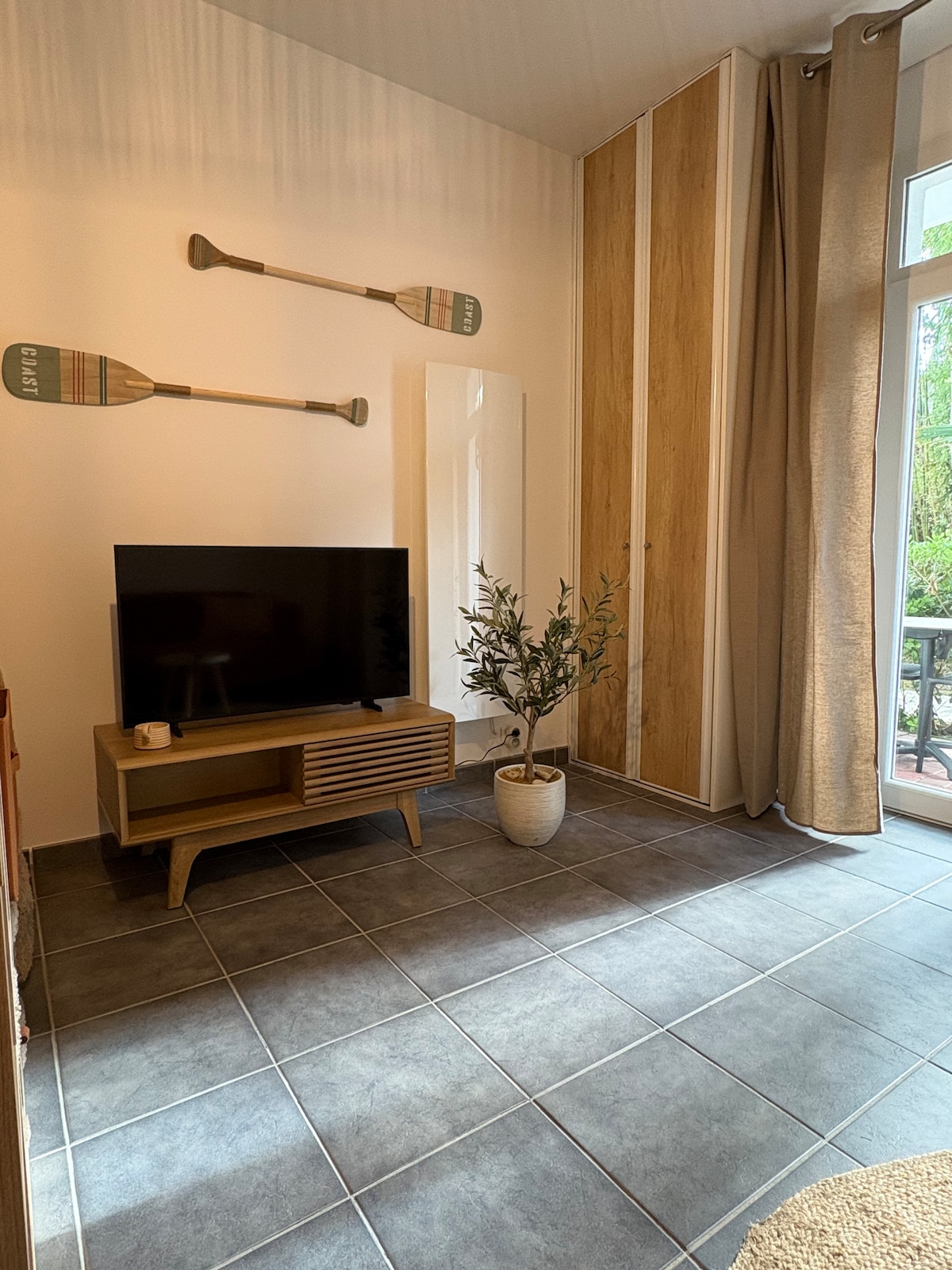 En medio de encinas y pinos marítimos, estudio nuevo de 25 m² con un altillo. Lejos del ruido y el bullicio, a 5 minutos en bicicleta del océano y a 5 minutos de las tiendas, déjese mecer por el canto de los pájaros y el del océano. Dispondrá de una terraza de 12 m2 y una entrada totalmente independiente. El estudio consta de un dormitorio en el altillo, una pequeña sala de estar, una cocina equipada y un baño con inodoro independiente. ATENCIÓN: el techo de la cocina y el baño está a 1,90 m.