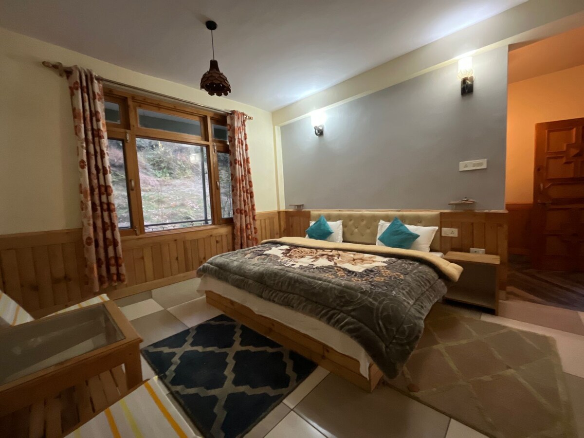 Nuestras habitaciones Deluxe tienen aire acondicionado frío/caliente, wifi, TV inteligente de 43 pulgadas con canales Ott, hervidor eléctrico, cama matrimonial con colchones de 10 pulgadas con calentadores de cama eléctricos, balcón frente al río y majestuosas vistas a las montañas. El baño en suite cuenta con todas las comodidades necesarias como toallas limpias, champú, gel de baño, crema hidratante, kits dentales, suministro de agua fría y caliente las 24 horas. El tamaño de la habitación es de 11x12 pies. El baño mide 7x5 pies. El tamaño del balcón privado es de 8x4 pies.