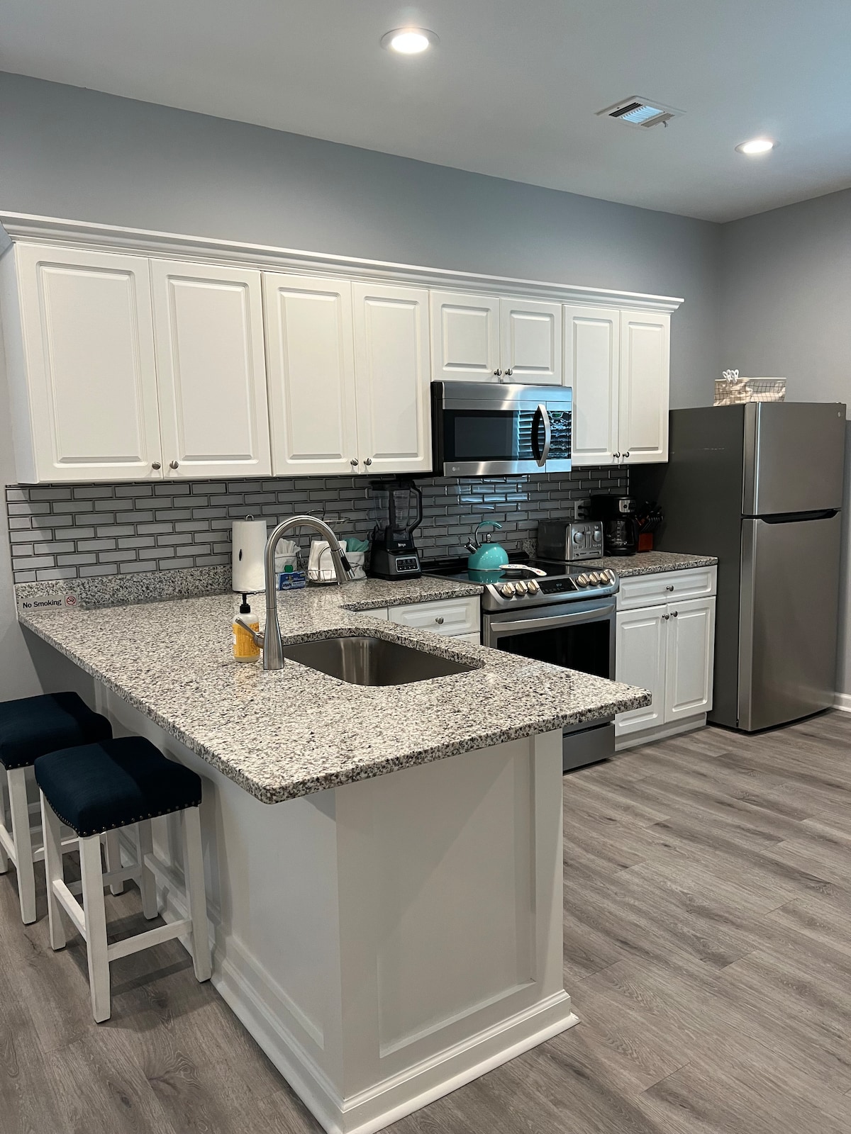 Decoración elegante, ubicación céntrica, a minutos del campo de golf, la playa, tiendas y restaurantes o quédate y cocina en una cocina completa. Ideal para viajes de negocios, con wifi abierto, televisión y lavadora y secadora completas.