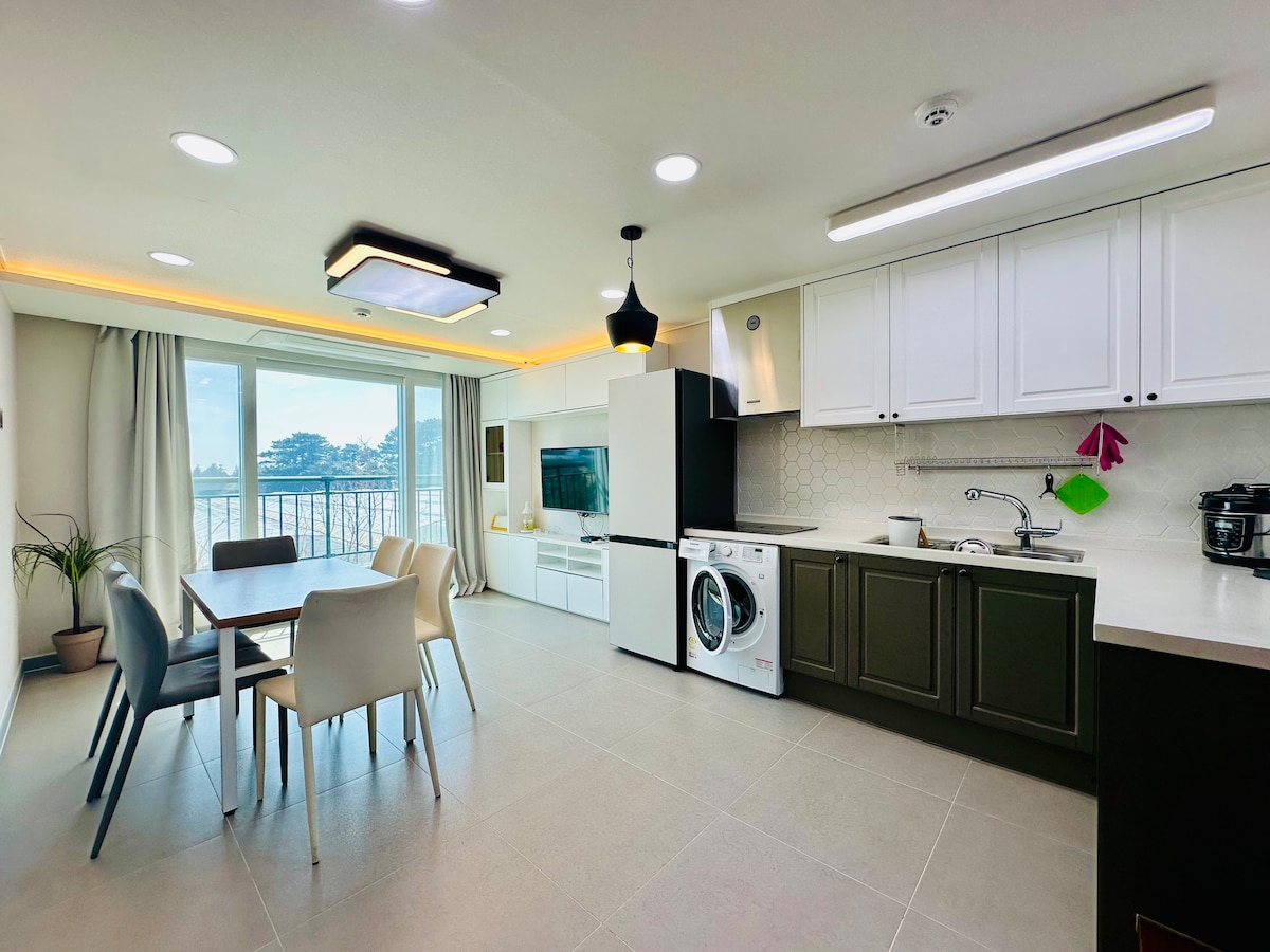 Oferta de apertura: Vista al mar en Seogwipo. Edificio nuevo. 2 unidades en planta baja. Terraza. 4 baños. 2 camas king y 3 camas queen. 4 estufas de gas. Opciones completas. Oferta de primavera para grupos.