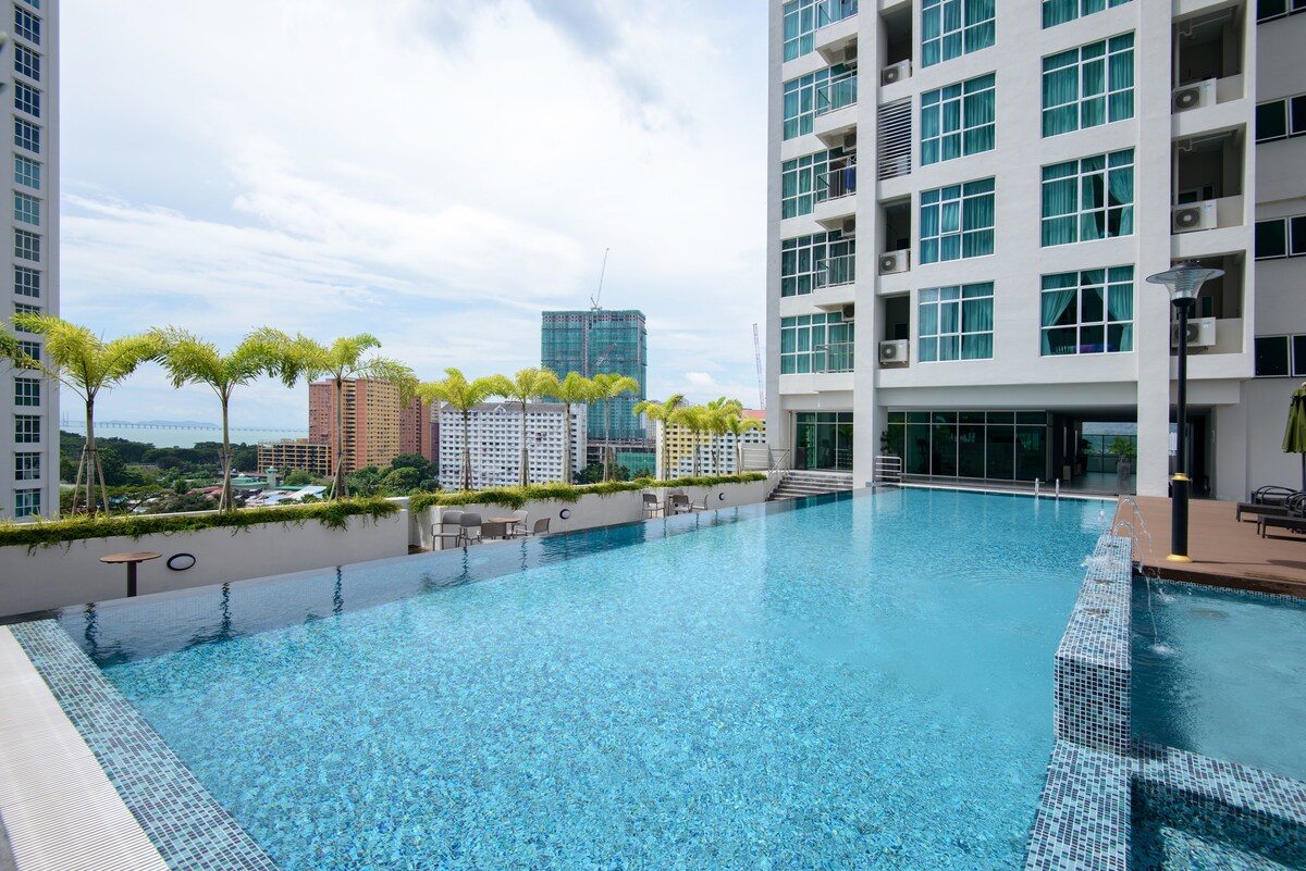 Nuestra nueva y acogedora suite está perfectamente ubicada en el corazón de Penang, con fácil acceso a las atracciones turísticas locales. ¡Restaurantes japoneses/coreanos y la tienda de comestibles 7-11 están justo debajo de nuestra casa! ¡Comida local, KFC y Pizza Hut a 5 minutos a pie! Ofrecemos • Excelentes servicios de hospitalidad. • Amanecer y vistas a la ciudad. • Entretenimiento con PS3 y Netflix. • 1 aparcamiento privado. • Wifi de 100 Mbps. • Vistas a la piscina infinita. • Totalmente climatizado. Si te gusta un lugar tranquilo y acogedor en esta concurrida ciudad, ¡no esperes, reserva ahora!