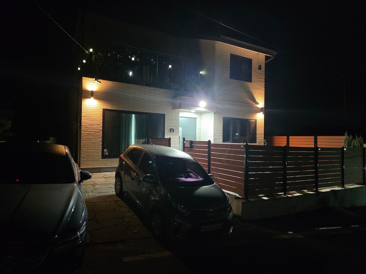 Esta es una casa con un bonito jardín que ha sido recientemente renovado. Hay una terraza al aire libre donde puedes relajarte cómodamente en el interior y al aire libre en un interior limpio y ordenado. Buen acceso a la ciudad y a la tienda de comestibles (a 5 minutos a pie hacia el apartamento).Hay instalaciones convenientes y restaurantes como bancos y hospitales alrededor del alojamiento, así que es conveniente. Los utensilios de cocina, los utensilios de cocina (mesa de comedor para 4 personas, varios vajilla, etc.), la lavadora, la silla de la sala de estar y varios electrodomésticos están bien equipados. 2 habitaciones con cama tamaño queen. Hay una sala de estar, cocina y 1 baño, y usa el segundo piso. Cada habitación, sala de estar y cocina tienen aire acondicionado, y hay un gran estacionamiento. Las escaleras de la terraza son hermosas hacia el exterior. Si tienes una barbacoa, alquilaremos Zaigl para que lo hagas en el interior, y hay un pago en el lugar de 20 000 won por un Zaigl. (Hay un pago en el sitio de 15 000 KRW por mascota y noche)