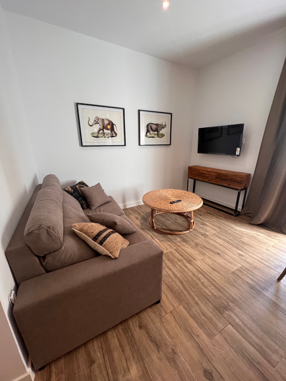 En una calle tranquila y coqueta . Se encuentra en una primera planta sin ascensor Dispone de 3 camas amplias, 1 de 160 y 2 de 110 en la entreplanta A diferencia de la mayoría de los apartamentos de 1 dormitorio que tienen 1 cama más sofá cama con la incomodidad que supone (no poder ver la tv los demás huéspedes mientras los del sofá cama duermen, tener que montarlo y desmontarlo …) Es un Plus!!!!