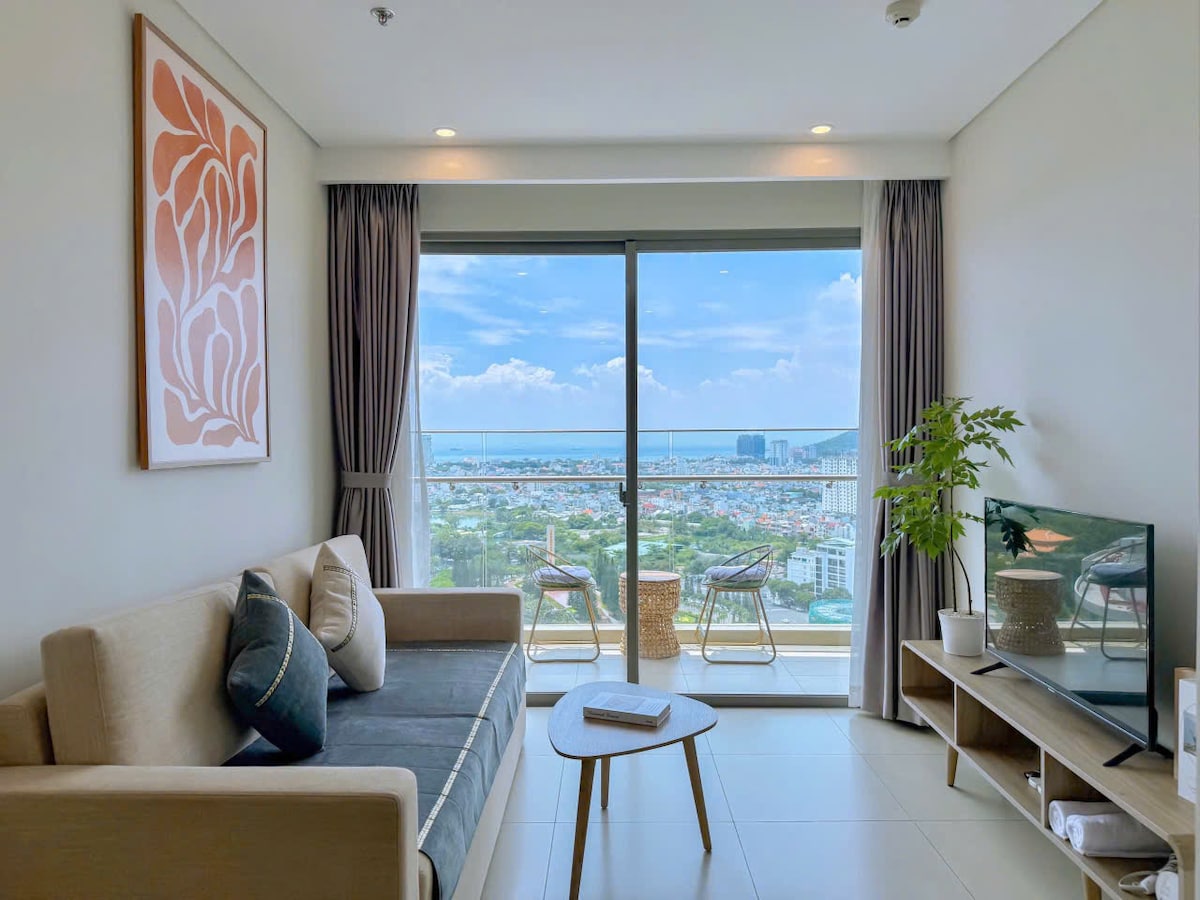 Minimalist, fully furnished 1BR apartment on the 15th floor with spectacular sea views. Ideal for couples or families with one child under 5. Perfectly located beside the Back beach (Thuỳ Vân beach). Estimated walking times to nearby amenities: - 2 minutes to reach the beach across the street - 5 minutes to the nearest 24/7 convenience store (GS25) - 8 minutes to the nearest supermarket (Lotte Mart) Fast elevators. Free Netflix. We also have one motorbike available for rent.