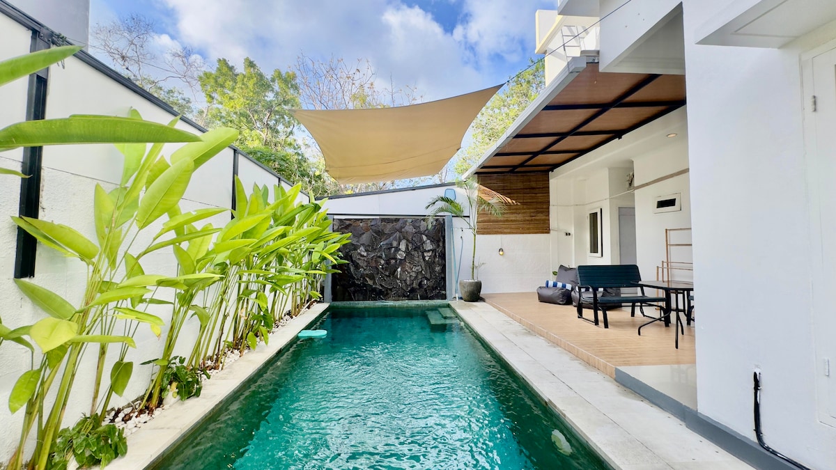 Villa de diseño de 1 dormitorio con piscina privada en Ungasan: • Acogedor dormitorio con iluminación de diseño. • Ventanas del piso al techo que se abren completamente a la naturaleza • Baño privado con ducha de efecto lluvia y acabados prémium. • Piscina geométrica privada. • Salón escultórico al aire libre • Cocina y comedor modernos - Wifi de 300 Mbps. • Limpieza diaria con toallas y sábanas frescas • Netflix y PS5, comodidades para bebés y parrilla a pedido. • Conserje para alquiler de scooters, traslados, visitas turísticas y más • Depósito reembolsable de 500.000 IDR, apto para mascotas