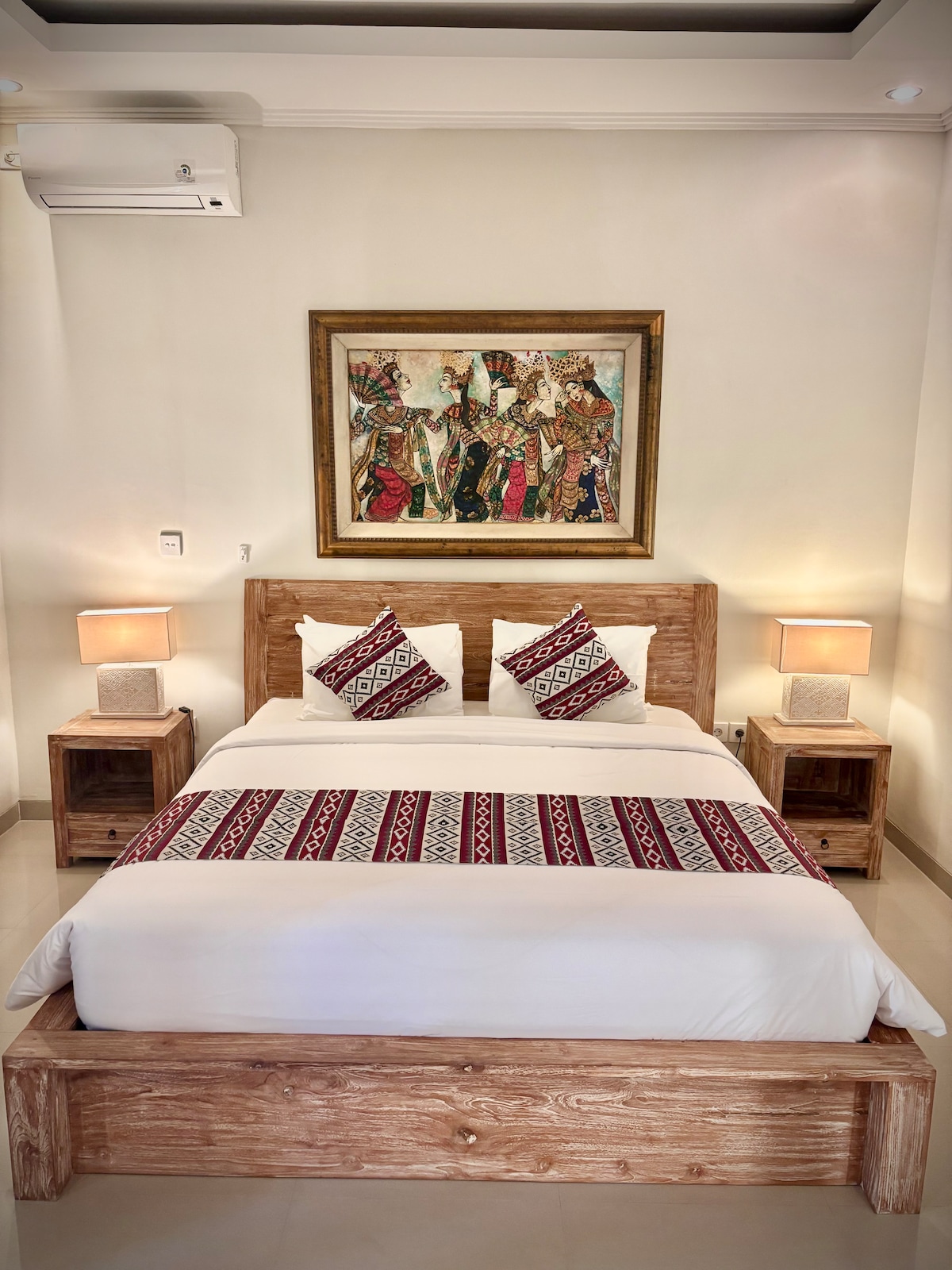Terkonsep dengan sangat detail, didekor etnik dengan sentuhan bohemia dan tetap dengan nuansa Ubud yang natural, dengan gaya lumbung (tempat penyimpanan hasil panen tradisional Bali). Villa ini sepenuhnya private, kolam renang, dapur semuanya untuk anda. Setiap pagi kami menyediakan sarapan dengan berbagai pilihan menu, hidangan bisa di meja makan ataupun terapung dikolam renang, sesuai permintaan anda dan itu sudah termasuk dalam harga🙂🙂