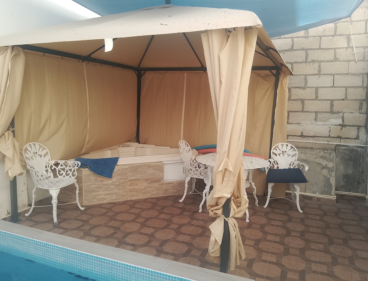 Este hermoso lugar con fuentes y bonita decoración es ideal para vacacionar,divertirse o relajarse. Ideal para eventos, fiestas o grupos hasta de 30 personas (buen espacio) Bonita alberca y zona de Jacuzzis Se encuentra a 30 metros del embarcadero llamado Club Náutico bajando por la pequeña zona hotelera y glorieta "Las Alas". A 9 minutos de Jardines de México lugar donde se presentan artistas internacionales.