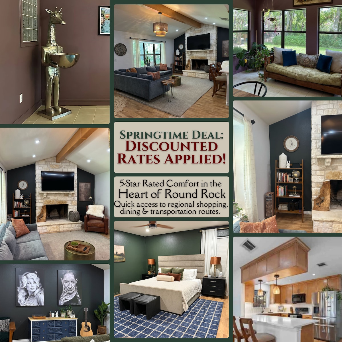 Disfruta de tu estancia aislada viendo ciervos en nuestra casa de campo Creekview en el corazón de Round Rock. Estamos en un barrio residencial tranquilo lleno de encanto y carácter. Esta casa totalmente vallada es ideal para familias y se admiten eventos. Pregunta por nuestros servicios de conserjería y decoración en el momento de la reserva. Tenemos fácil acceso a todas las carreteras principales, a 5 minutos de restaurantes, bares y tiendas de DT Round Rock, a 10 minutos de Dell Diamond y Kalahari, a 12 minutos de Domain y a 25 minutos en coche de Uber de DT Austin.