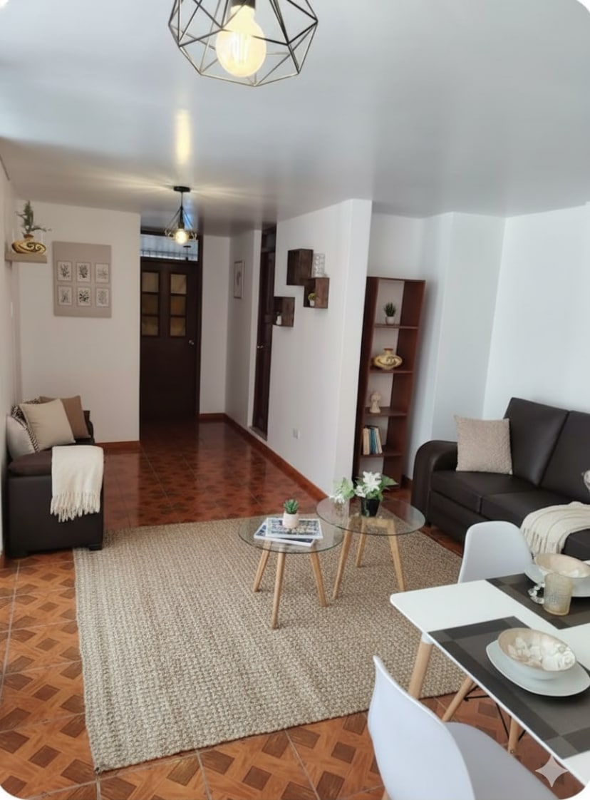 Disfruta de la sencillez de este alojamiento tranquilo y céntrico. Acogedor departamento frente al mall, lleno de luz y detalles pensados para ti. Cuenta con 2 habitaciones con cama de dos plazas, TV y closet, además de una sala cómoda y un comedor para 4 personas. Ubicado en zona segura, con todo lo que necesitas a pocos pasos: tiendas, restaurantes y servicios. Un espacio cuidado con amor, ideal para que te sientas como en casa y disfrutes de una estadía tranquila y confortable.