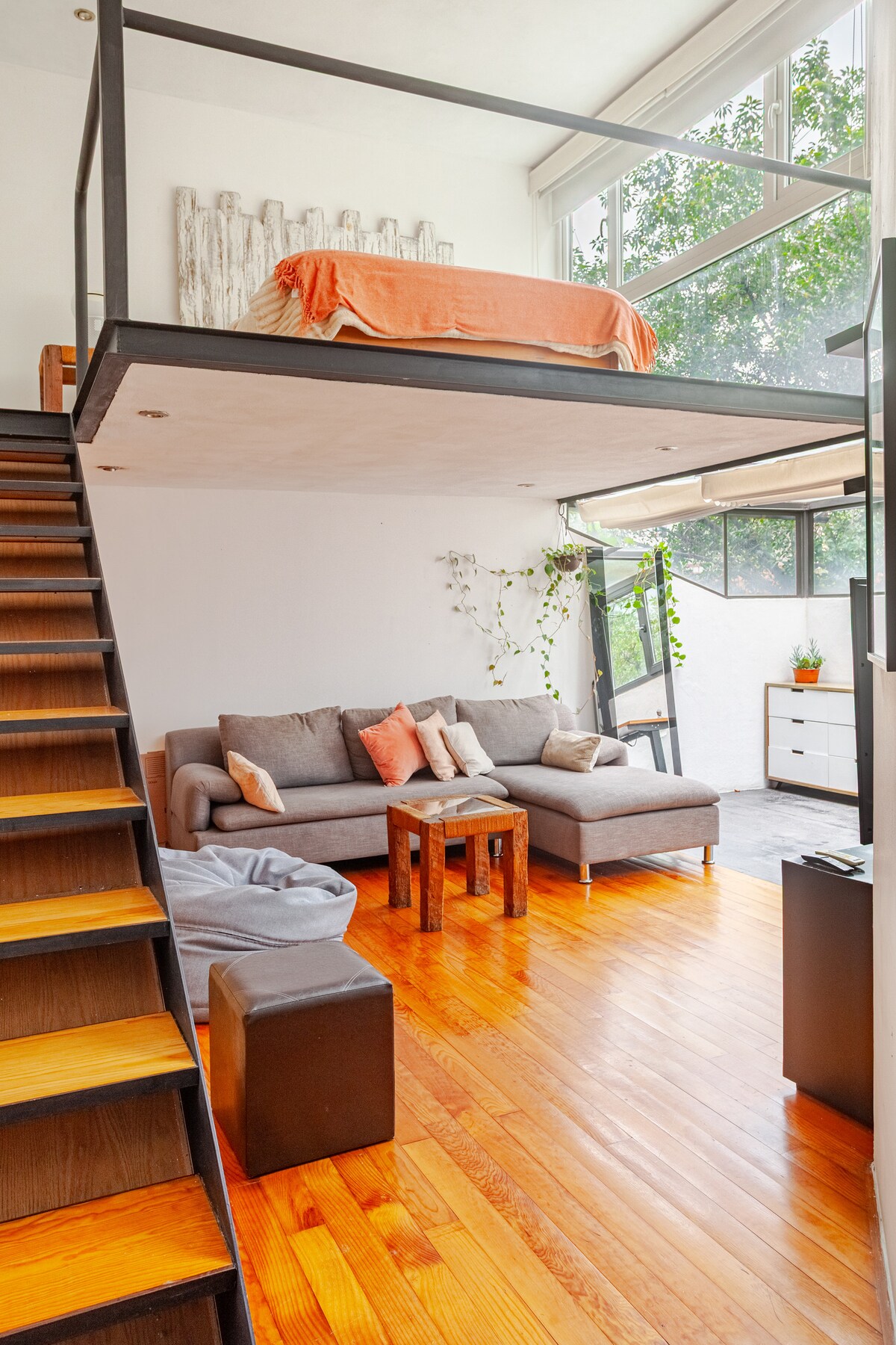 Push open folding big doors first thing in the morning and step onto a green patio for a blast of fresh air and daylight. The big floor to ceiling doors keeps the apt ventilated and fresh. High ceilings with clay and wood beams, bunch of light, and artesanal tiles and wood floor. The place is silent, carefully decorated, very nice for work or just to be here. This new one: https://www.airbnb.mx/rooms/1604605046335668118?guests=1&adults=1&s=67&unique_share_id=4dd1b1c9-fc93-4c94-9ca1-c91cd0256dae