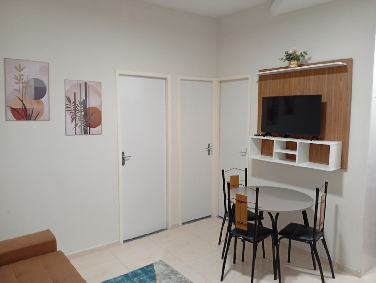 Apartamento entero, 1 dormitorio, con cama tamaño queen, armario, ropa de cama, almohada, baño social 3 colchones adicionales 1 sofá cama cocina completa. Área de servicio Televisión inteligente y wifi ubicado en el centro, acceso al transporte público, cerca de la panadería, el mercado, el restaurante, la farmacia y los bancos Lugar sencillo pero acogedor para pasar días tranquilos. No hay ducha eléctrica, no hay traje de baño, no hay estacionamiento. NO ACEPTAMOS MASCOTAS