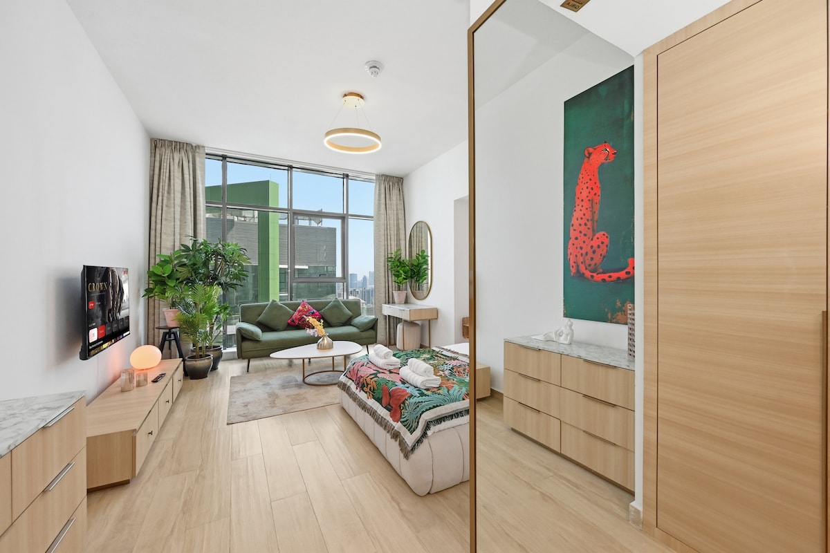 YieldStay: Estudio elegante con balcón | Piscina • Gimnasio Estudio moderno en JVC, Dubái con balcón privado. Cama tamaño queen, TV inteligente, Wi-Fi y cocina pequeña. Disfruta de los servicios de estilo resort: piscina al aire libre gimnasio sauna Seguridad 24/7 y supermercado en el lugar. Ubicación privilegiada cerca: Centro comercial Circle Miracle Garden Global Village y Autódromo de Dubái. Adicionales: Estacionamiento gratuito. No se admiten mascotas ni se permite fumar en el interior. Ideal para parejas. Viajeros solos y huéspedes de negocios.