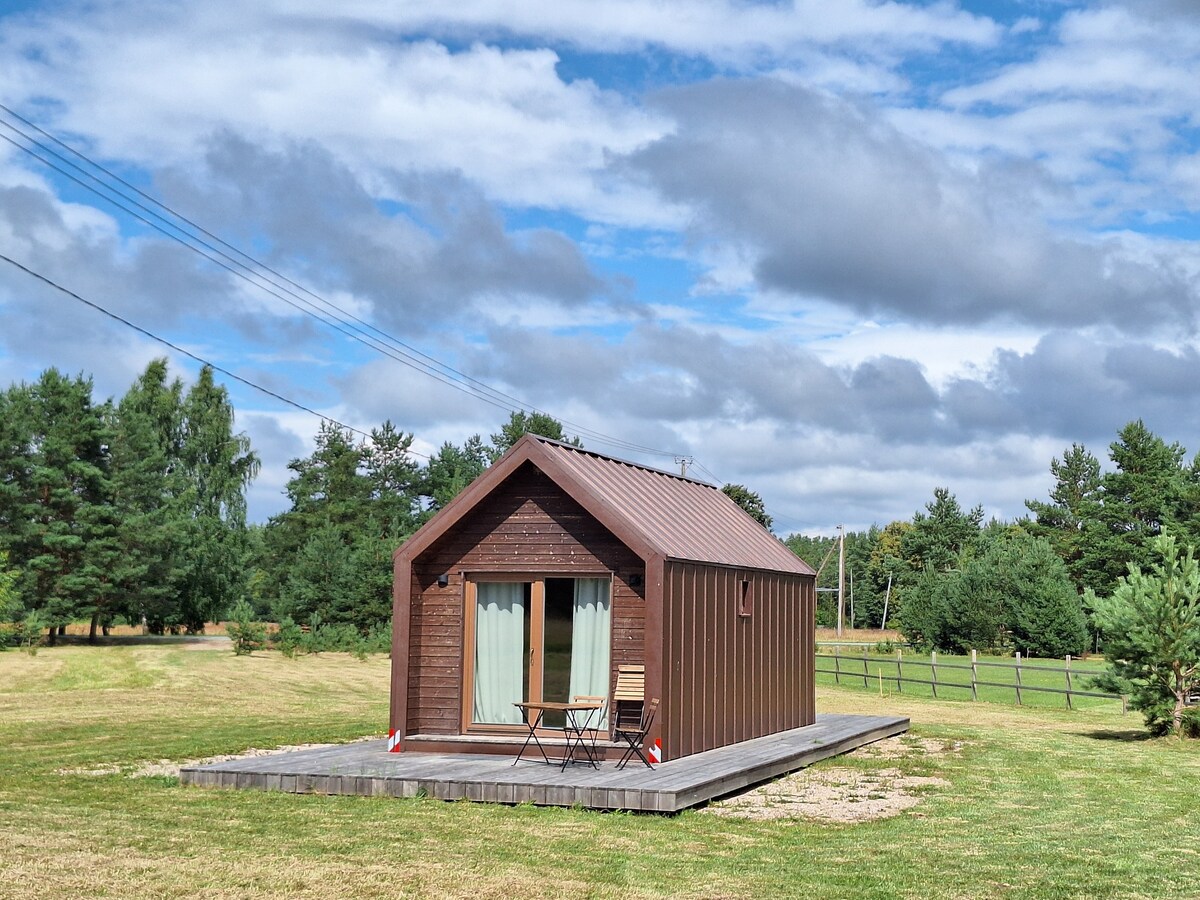 This is a cottage overlooking the meadow and the nearby forest. The cottage has a small terrace, where you can enjoy your time and relax. There is a small kitchen area and a bathroom with a shower. The cottage is located in country estate Lūķi, 2km to the beach. The estate has a picturesque landscape with large oaks, a tea garden, an authentic sauna, and garden shed. There is also a salon with an exhibition of handicrafts.