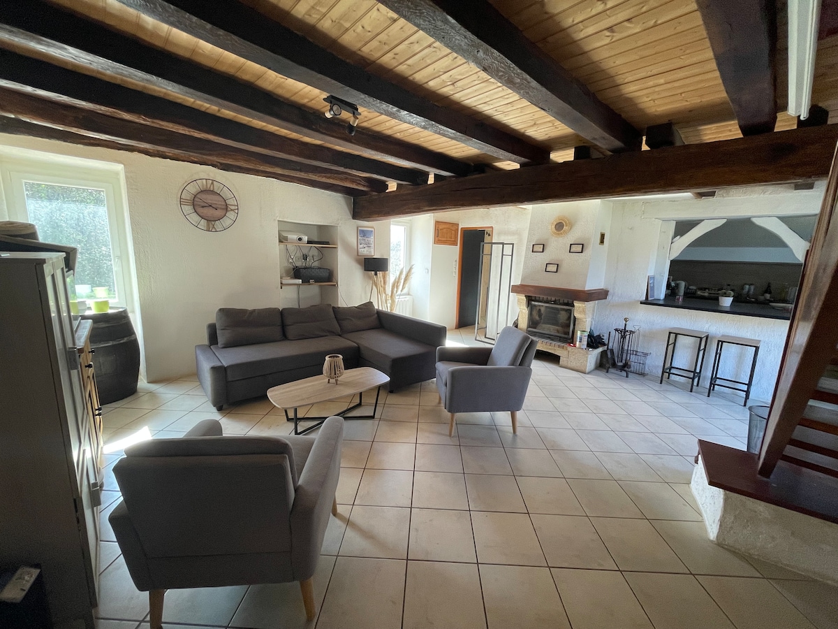 Casa rural en medio del campo, casa de campo restaurada que puede alojar a 7 personas + bebé, 3 habitaciones, 1 de paso una habitación con 2 camas individuales que se pueden unir para hacer una cama doble una con 2 camas nido y 1 cama individual una con 1 cama individual de 135 cm+ cuna Sala de estar comedor de 40 m², estufa de leña Cocina equipada, acceso wifi Gran cuarto de baño, ducha a ras de suelo, inodoro y lavadora Aseo independiente Barbacoa Terreno alejado de la carretera, NO SE ADMITEN ANIMALES