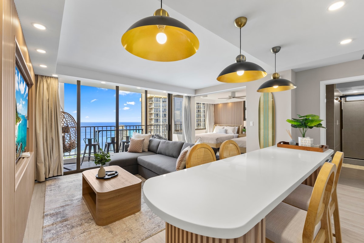 Este lujoso condominio de esquina de 1 dormitorio se encuentra en el corazón de Waikiki y a pocos minutos a pie de la playa, con vistas panorámicas al mar de las aguas hawaianas. Esta suite está bellamente diseñada y totalmente renovada con muebles y decoración modernos. A solo unos pasos de la famosa playa de Waikiki, estarás rodeado de auténtica cultura hawaiana, restaurantes locales favoritos, restaurantes elegantes, plazas comerciales y acceso a la playa. Este departamento es perfecto para parejas y grupos pequeños que viajan.