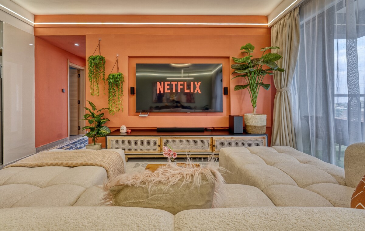 1 min to The Junction Mall — cafes, restaurants, cinema, supermarket at your doorstep. 75" TV with Netflix, HBO, Prime & more. Mesh WiFi throughout. Updated Feb 20, 2026: Backup power across main living areas — blackouts won't interrupt your stay Spacious 2-bedroom, African-inspired design. Sleeps 4. Full kitchen with real appliances — not just a kettle and a prayer. Two modern bathrooms, walk-in showers, fresh towels & toiletries. Gym, heated pool, kids' play area, parking, 24/7 security.
