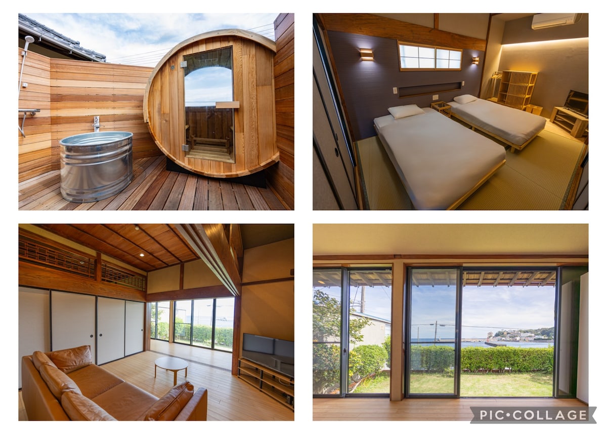 稲取、海が見える1棟貸し!バレルサウナ付き、家族で泊まれる貸別荘!絶景とプライベート空間を満喫!