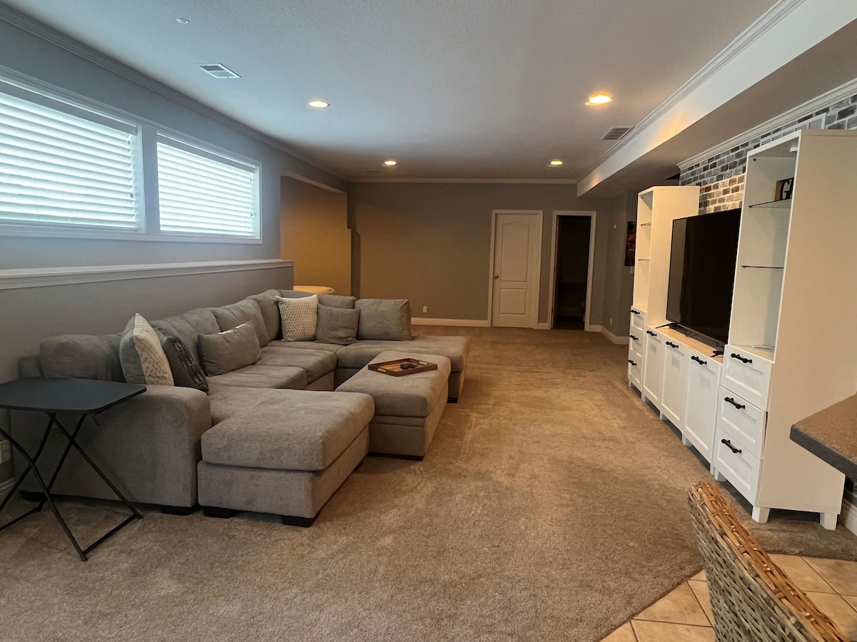 1 cama tamaño king. 1 colchón de aire doble plegable (solicita cama plegable). Lavadora/secadora para tu uso. Wi-Fi de fibra. Área de patio trasero cercada por separado con entrada privada a tu área de sótano que se encuentra alrededor de la parte trasera de nuestra casa principal. Espacio de estacionamiento en la propiedad. Parque para perros, senderos para caminar. Se cobra una tarifa por mascotas. Cerca de la autopista y de las tiendas. También contamos con paneles solares que proporcionan algo de respaldo para el calor/aire y refrigeración. Todo el sótano de luz diurna está separado de nosotros arriba con la puerta cerrada. Tiene un par de escalones.