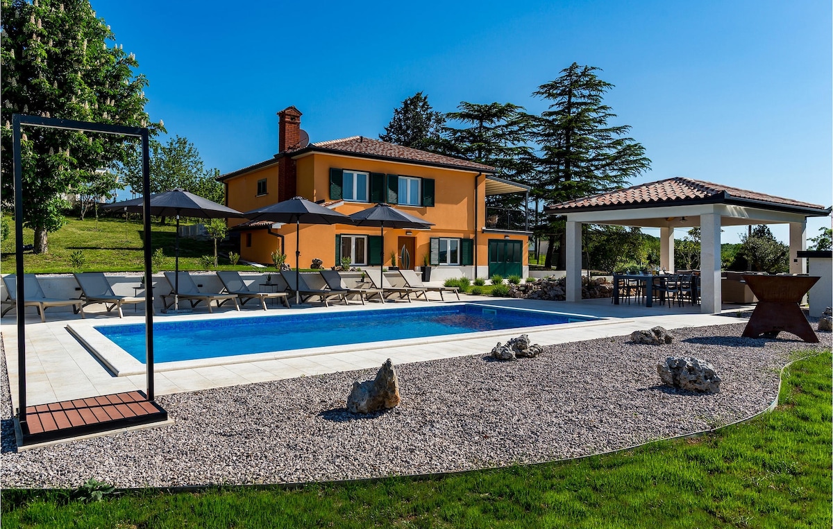 This is a beautiful villa with a swimming pool, unique in its location and the terrain that surrounds it. On one side there is an unforgettable view of the historic town of Labin on a hill to which you can walk, while on the other side the view extends to the islands and Kvarner. The owner of this house has an extremely large land with fields and vineyards, so you can walk, ride a bike or swim in the pool while enjoying an unforgettable view.