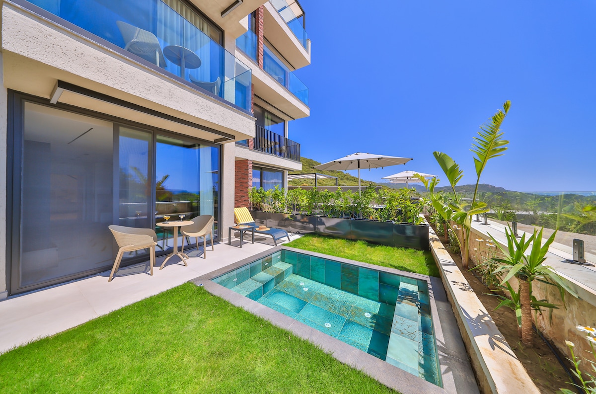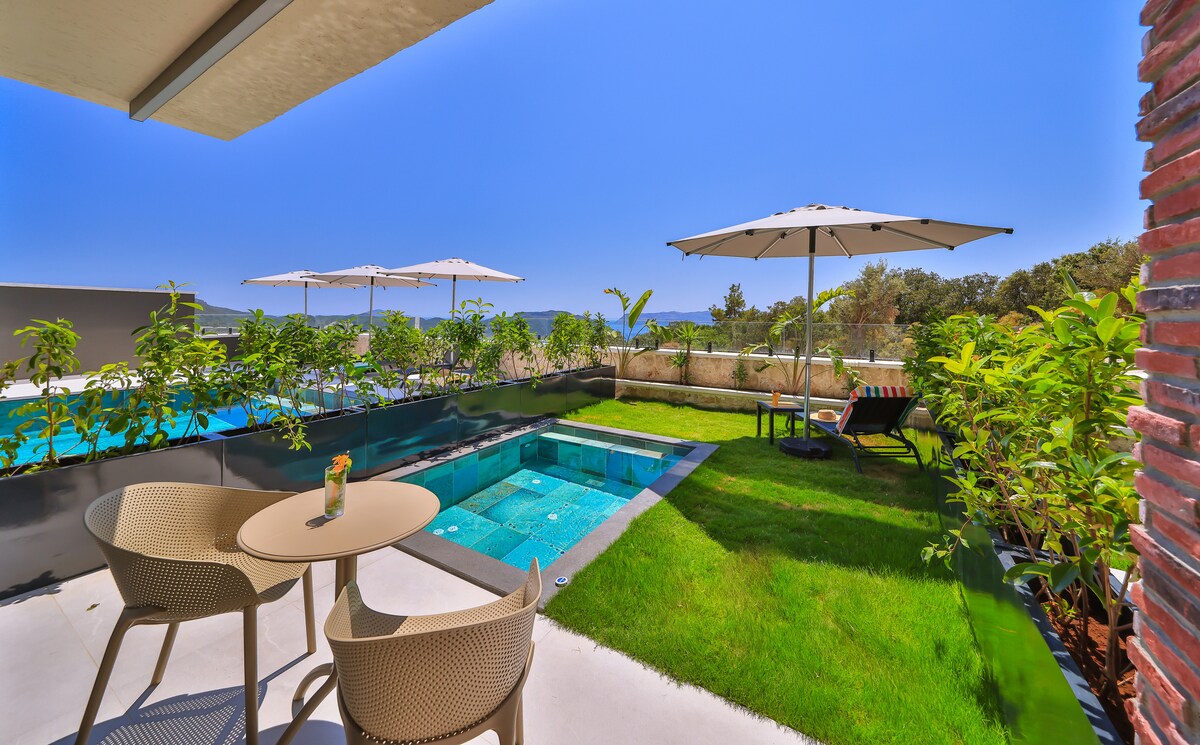 Con una sala de estar totalmente equipada de 35 a 40 metros cuadrados, esta habitación tiene una piscina privada y una bañera de hidromasaje con vistas a la naturaleza y al mar. La habitación está en un edificio de 2 a 5 minutos en coche de la playa de Büyükçakıl y del centro de Kas. El edificio también tiene dos piscinas grandes. Un lugar de vacaciones único para aquellos que aman Kas, la historia y la naturaleza. Durante tus vacaciones puedes hacer muchas excursiones, como excursiones en barco, kayaks, inmersiones, puedes disfrutar de la naturaleza y el mar.