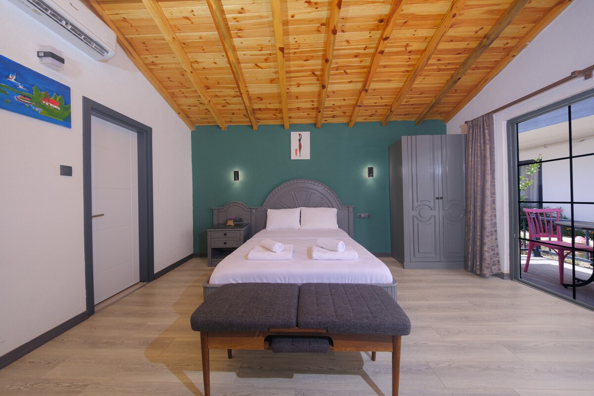 Our 2-bedroom apartment, located within our hotel in Patara, is ideal for families and friends. The master bedroom has a double bed, private bathroom, and AC; the second bedroom has two single beds and AC. Features include a full kitchen, living room, TV, and extra bathroom. Guests enjoy free use of our hotel’s pool. Easy access to Patara Beach and the ancient city.