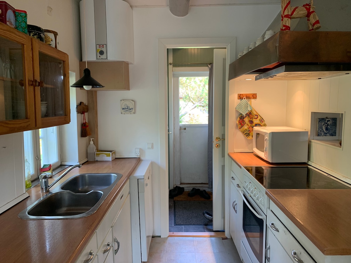 Relájate con familiares y amigos en este alojamiento en un encantador terreno sin molestias y en una carretera cerrada con solo 200 metros de la mejor playa de North Samsø. La casa tiene 1 habitación con cama doble, 1 habitación con cama individual y sofá cama en la sala de estar. Inodoro con bañera. Cocina con todo lo necesario. Sala de estar con estufa de leña. Parrilla de gas en la terraza cubierta y un gran jardín con hamaca. Se permite traer un perro y hay cuencos en la casa. Trae esto tú mismo: Ropa de cama Toallas de cocina