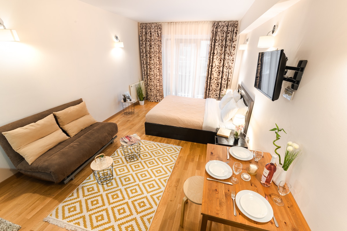 A solo un minuto a pie del telesilla principal Gondola. El apartahotel se encuentra en el distrito New Gudauri, Redco Loft 1 . Viene con taquilla gratuita para guardar el esquí. Amplio y acogedor estudio con balcón con vista a la montaña. Netflix y cable, TV grande y inteligente. 37 m2 - Capacidad para 4 personas cómodamente. Está totalmente equipado con todos los servicios de cocina para cocinar, wifi gratuito. Supermercado justo en el edificio, todas las demás tiendas y restaurantes, tiendas de alquiler de esquí en 1 a 2 minutos a pie.