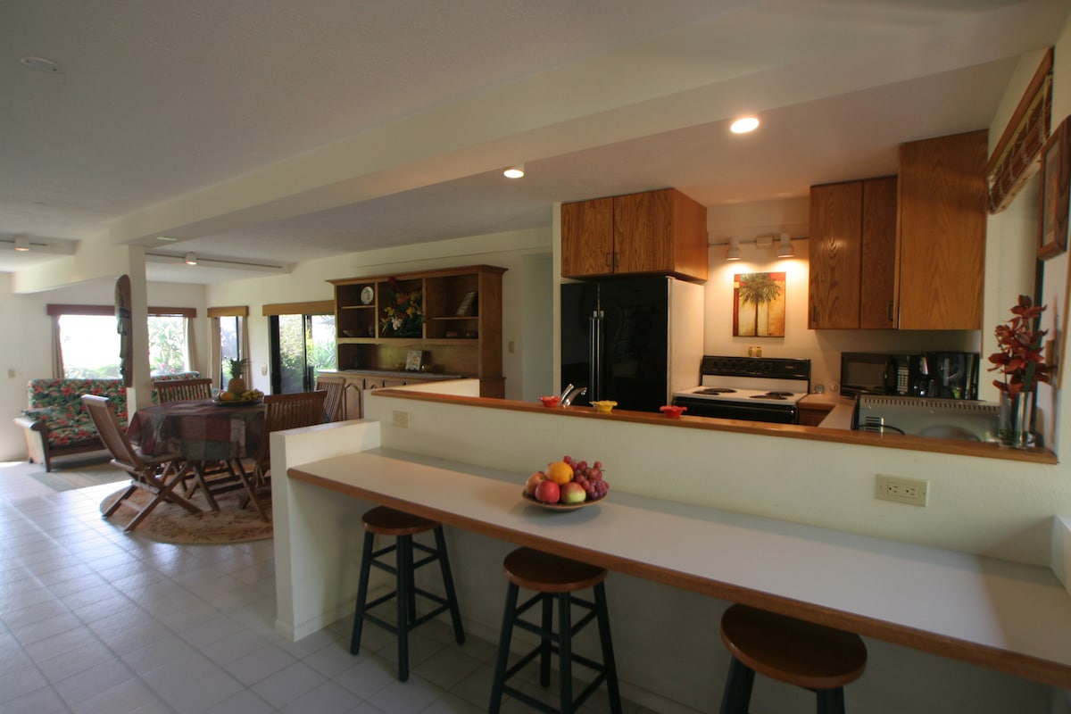 Escapa a nuestra granja de café Kona de 3,5 acres, ideal para familias, enclavada en las montañas a minutos de las playas, a 15 minutos de Kailua-Kona y a 5 minutos de Captain Cook. Los niños pueden alimentar a nuestras amigables gallinas, ver gecos y explorar los exuberantes jardines llenos de cafetos, frutas y flores. La moderna granja de 3 dormitorios y 2 baños incluye un amplio lanai, perfecto para comidas familiares, café por la mañana y contemplar las estrellas. Disfruta de las frescas brisas de la montaña, un escape refrescante del calor costero y la magia del café Kona.