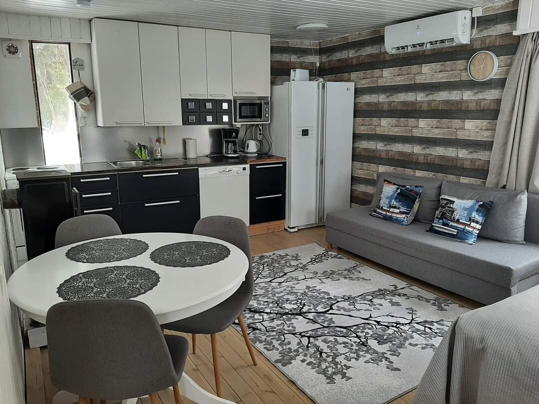 Relájate en este espacio tranquilo y elegante de 32,5 metros cuadrados de privacidad Rincón de cocina con microondas,cafetera y hervidor de agua Refrigerador y estufa de 2 placas Vajilla para 4 personas,ollas, sartén y utensilios de cocina Un sofá divan para dos personas en una cocina de tabaco con colchón. Un colchón adicional para uno Mantas, almohadas, sábanas y toallas para todos los huéspedes Sauna de leña y estufa de leña en la sala de estar, cuya calefacción se acuerda con el anfitrión. Aparcamiento