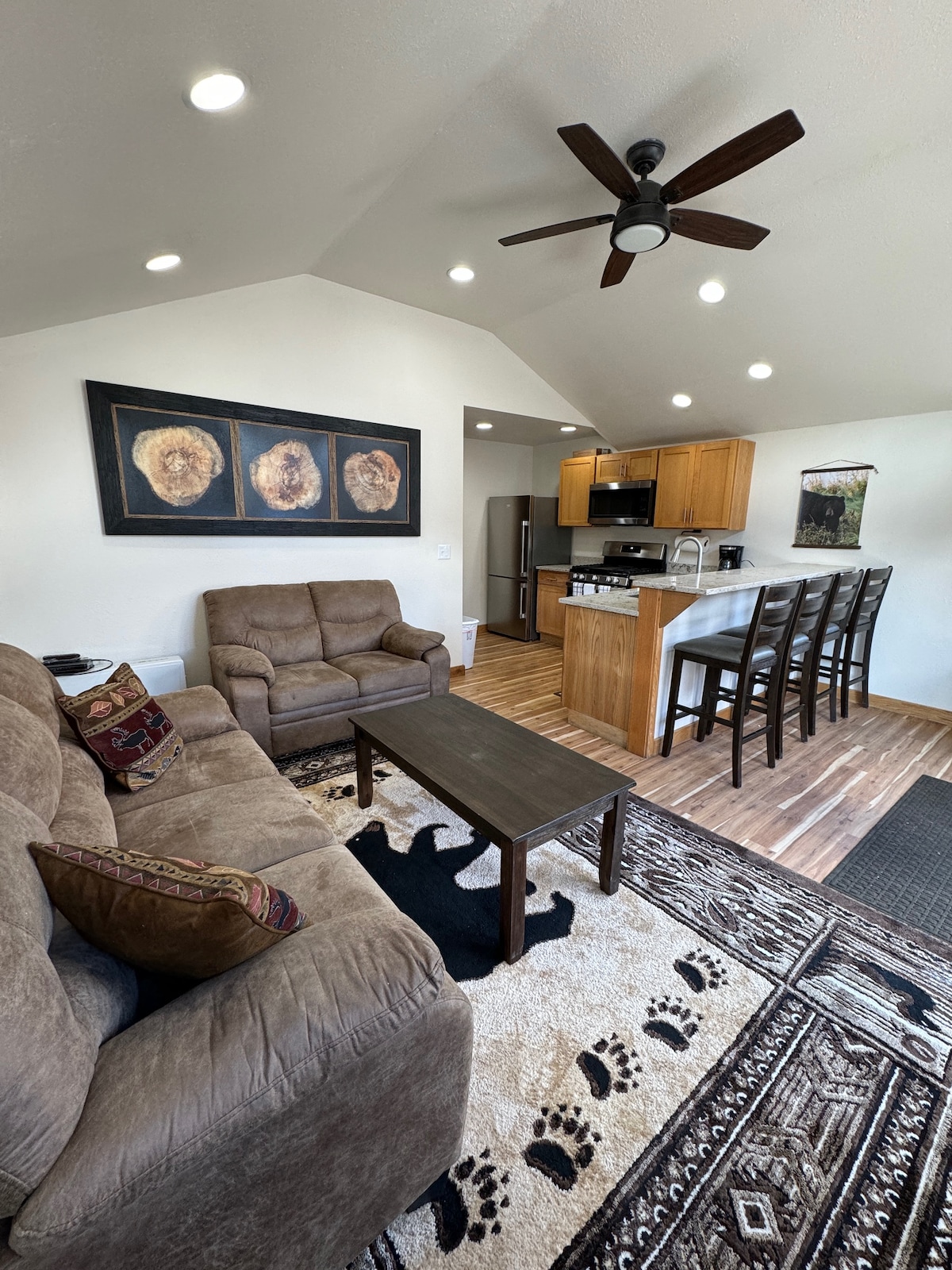Newly constructed 2024 cozy cabin on the world-famous Kenai Lake. You will enjoy magical scenery including the Chugach Mountains, Kenai Lake, and Snow River Glacier. The cabin boasts a full-size, well-equipped kitchen. The bedroom has a full closet, washer/dryer, and king-size bed. The full bathroom has a large shower. The queen-size sleeper sofa provides comfortable sleeping for additional guests (perfect for kids or teens). The cabin deck is complete with seating and propane grill.
