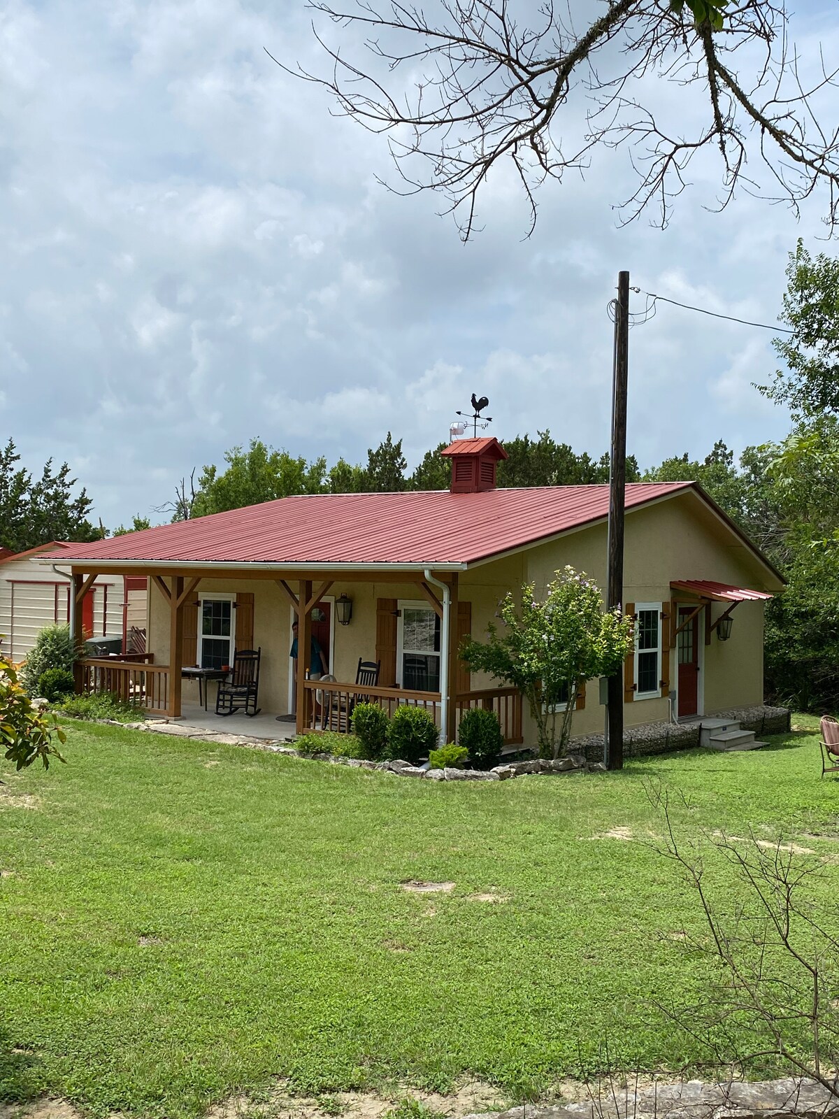 Acogedora cabaña de invitados en Hill Country con un gran porche.