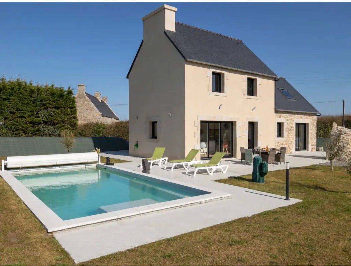 Este alojamiento ofrece una estancia relajante para toda la familia. Situada en la costa norte de Finisterre, bordeada por el Gr 34 (a 5 minutos a pie) paraíso de los excursionistas, descubra esta Villa nueva, de lujo, espíritu junto al mar con piscina cubierta privada climatizada (del 1 de mayo al 1 de octubre). Situado a solo unos pasos del puerto de Plouescat, barrio animado en verano restaurantes bares y hermosas playas de color caribeño. Es en una pequeña calle tranquila que encontrará la villa .