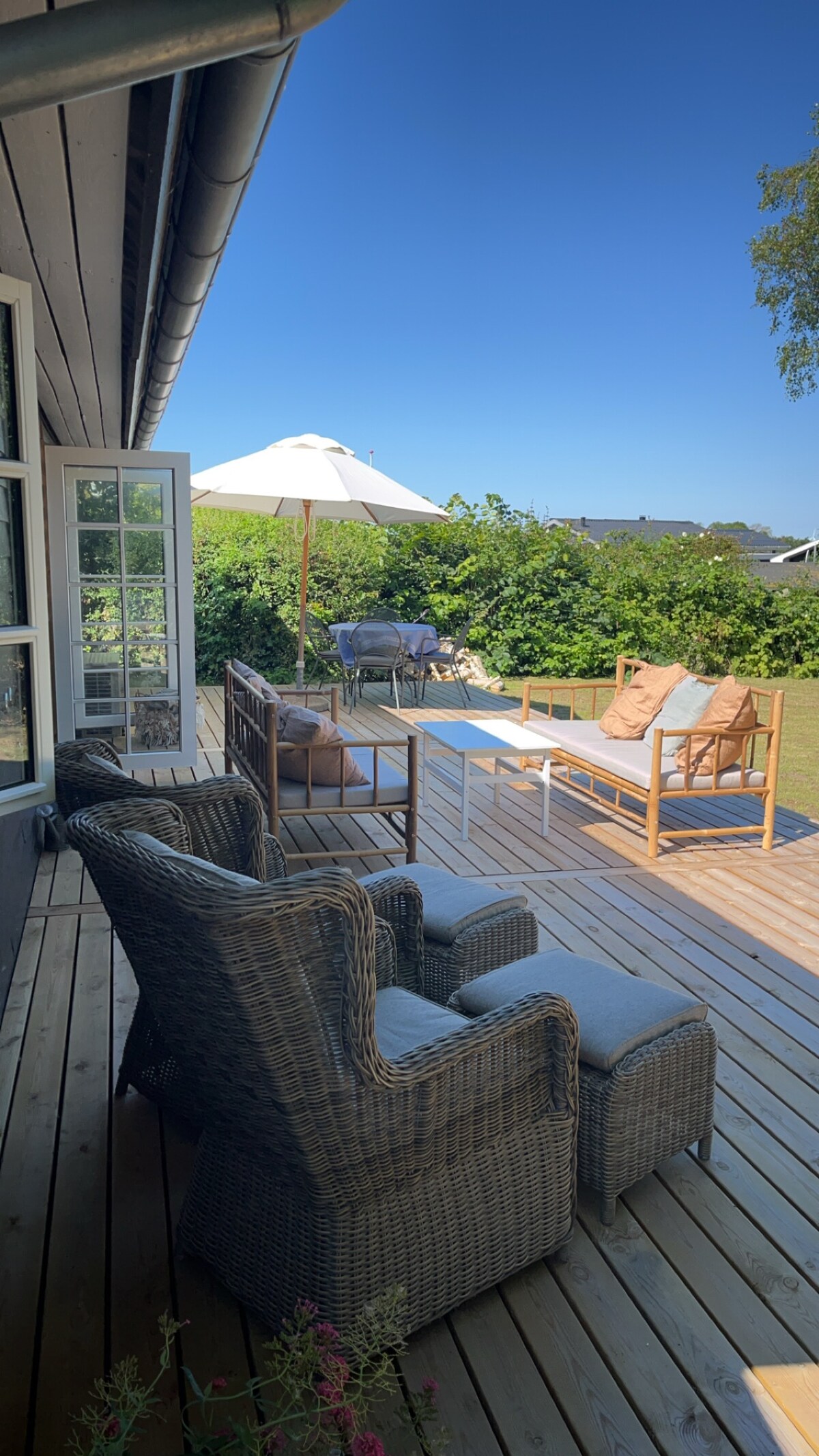 Una casa de verano de 65 metros cuadrados de 1998 con una estufa a leña. La casa está en el pueblo de verano de Kerteminde, en la segunda fila de la playa. Luego puedes ver el agua y el gran puente del cinturón desde la terraza. Está a 150 metros de Nordstranden, que es una de las mejores playas de Funen. Pero lo más importante es que es una casa llena de luz, tranquilidad y buenos recuerdos. La casa es de 1998, pero antes de que la casa de mi abuela estuviera en la propiedad, por lo que en estos alrededores he pasado todas mis vacaciones de verano de la infancia con panqueques, nutellamadder y juegos.