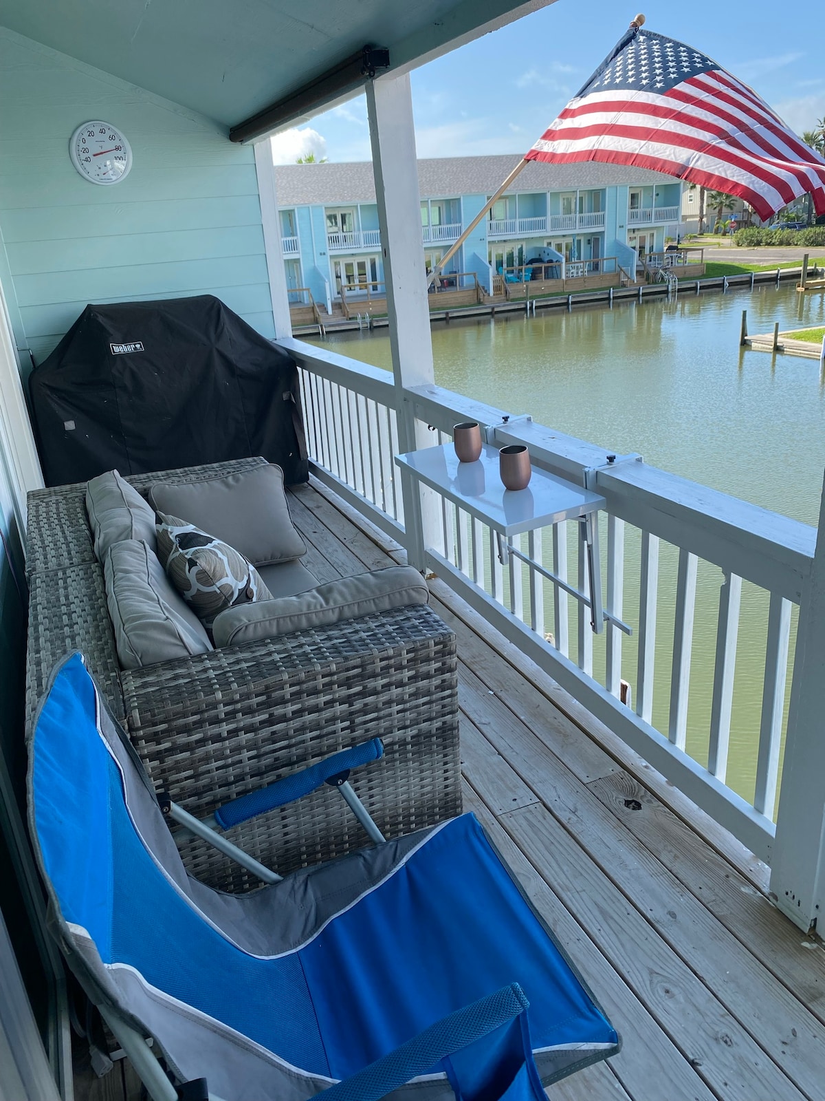 2 bedroom, 2.5 bath, updated in 2020/21. Near Rockport beach, dedicated boat slip outside back door. Everything for a romantic weekend, fishing or family vacation. Enjoy sunrise with water view, 3 TVs, 2 community pools, or afternoon drinks on shaded deck. 1st F: Kitchen, dining, living, laundry, 1/2 bath, (fold out couch) 2nd F: 2 bedrooms, 2 full restrooms. If bringing boat please message for more info. Also have 2nd condo, 4 doors away if you have a larger group please inquire