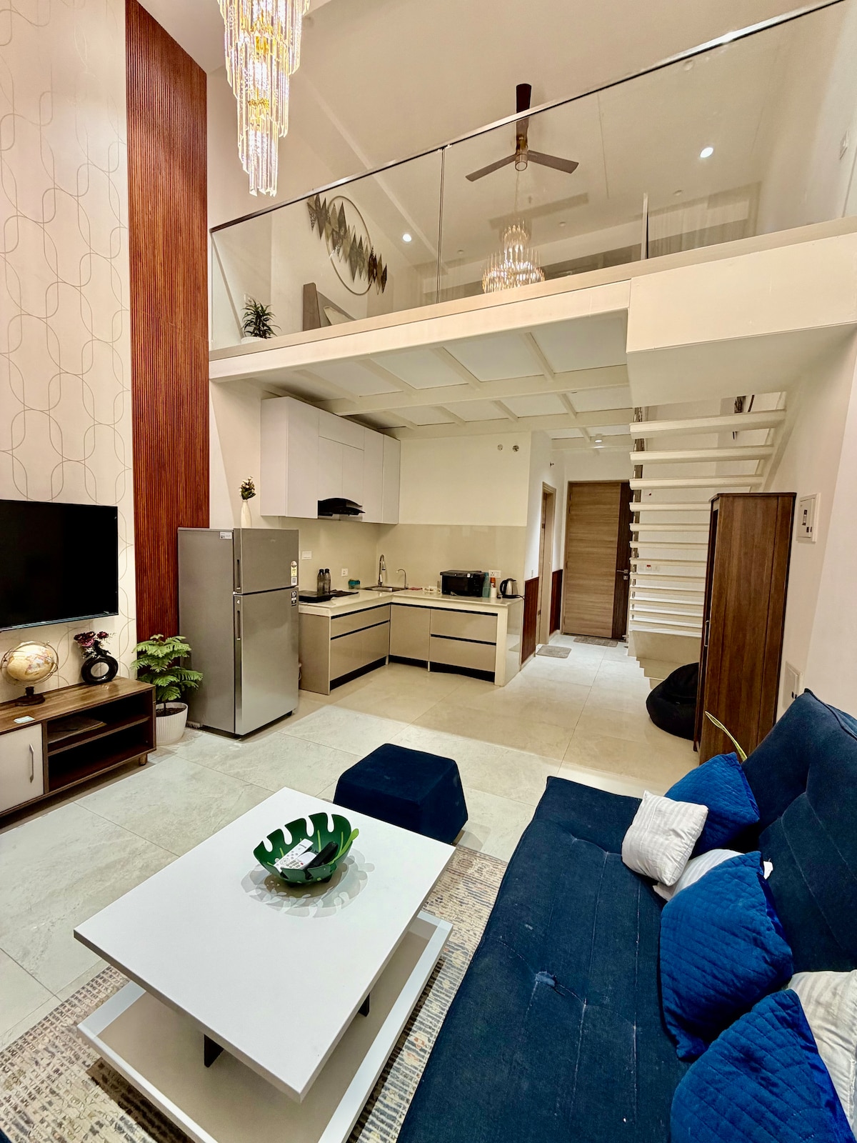 Welcome to your Luxury Loft with Balcony, a private duplex apartment on the 10th floor, with skyline views of the city, designed for comfort and style. A bright double-height living area with elegant decor, warm lighting, and cozy seating. Upstairs is a king-sized bed and a dedicated workstation. Step onto the balcony for evening tea or coffee . Enjoy high-speed Wi-Fi, Netflix and chill on the Smart TV, a fully functional kitchen, self check-in, and all comforts for a stylish stay in Gurugram.