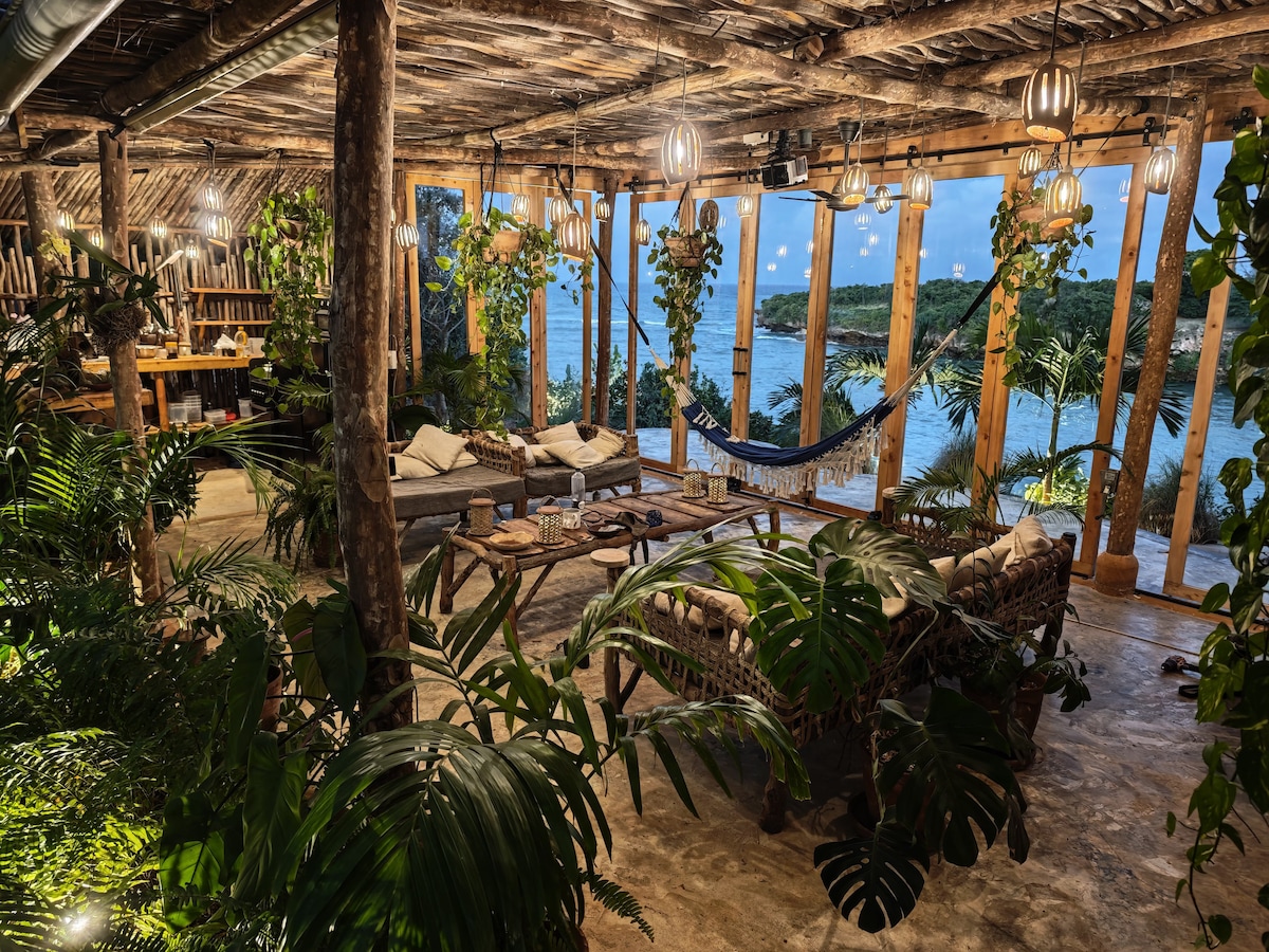 Jungle meets ocean at Figgito - sandwiched between tropical green and the endless blue. Two glass walls open fully to the sea; vines cascade from rafters inside as monstera climb the pillars, blurring the line between in and out. A kilometre of pristine beach waits below at low tide, reached through a private tunnel. Shower by two among palms and watch bush babies feed at dusk. Shaky chic - raw, wonky, entirely functional. A place to truly luxuriate.