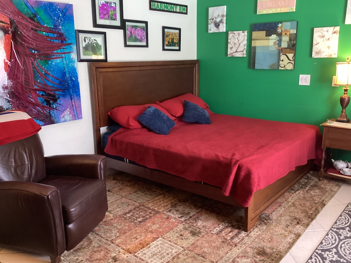 Lujoso estudio privado con entrada privada (440 pies cuadrados, capacidad para 3 personas/2 coches) está unido a nuestra casa y a 1,7 millas de la playa y adyacente a Ft Lauderdale. Aparca bajo la cochera cubierta. 1 cama tamaño queen (y 1 colchón tamaño queen inflable), 1 baño, cocina pequeña, wifi de fibra óptica, TV de pantalla plana (140 canales), ventanas a prueba de impactos, armario enorme, ventilador/luz, aire acondicionado con mando a distancia, escritorio, silla, mesa plegable para comer con sillas, nevera pequeña, microondas, horno tostador, parrilla Foreman, placa calefactora, cafetera.
