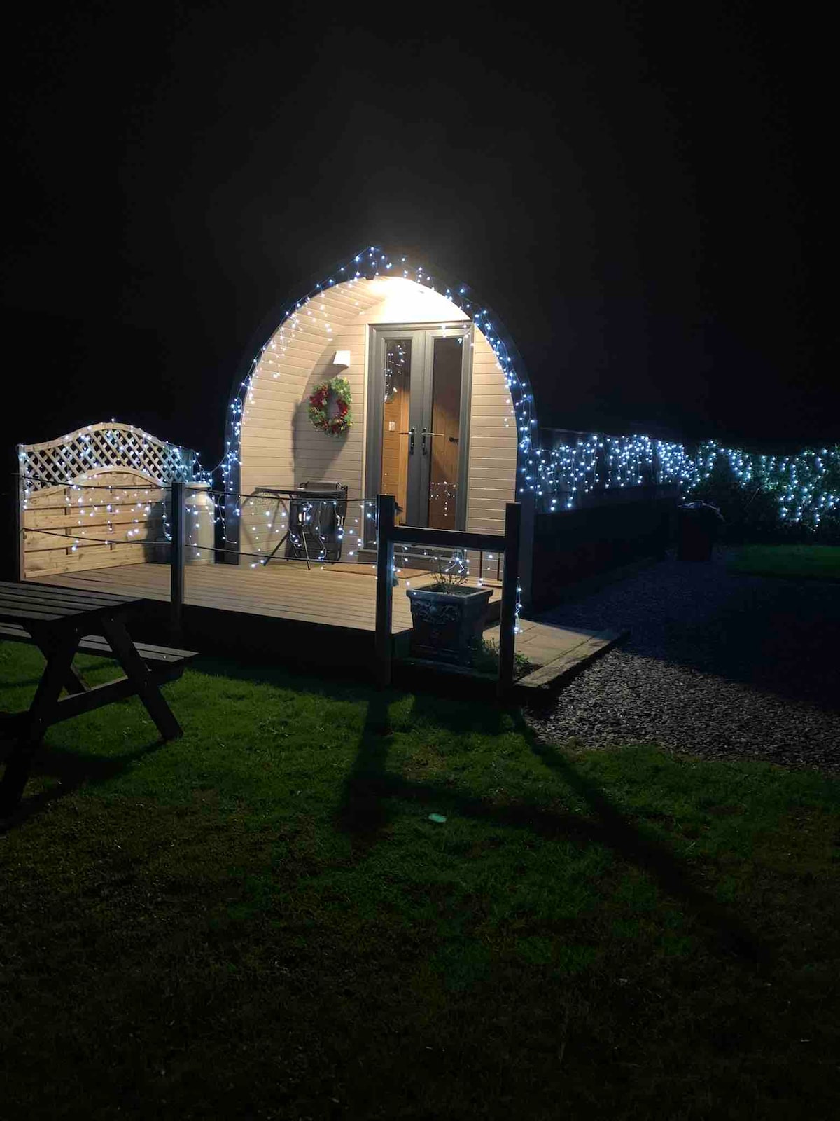 Plas Onn Isa Glamping Pod se encuentra a 1,1 millas de Abergele, hogar de “I 'm a Celebrity Get Me Out Of Here” en el castillo de Gwrych, a pocos pasos. Nuestra cápsula tiene capacidad para 2 adultos, mayores de 18 años. No se permiten mascotas. Calefacción por suelo radiante. Hay una zona para dormir con cama doble de planta abierta con TV y sala de estar con mesa y sillas. Se proporciona ropa de cama, tiene baño privado, pero no toallas de baño. La cocina tiene fregadero, nevera pequeña, microondas, hervidor de agua, tostadora, té, café y azúcar suministrados con cápsulas de leche Uht.